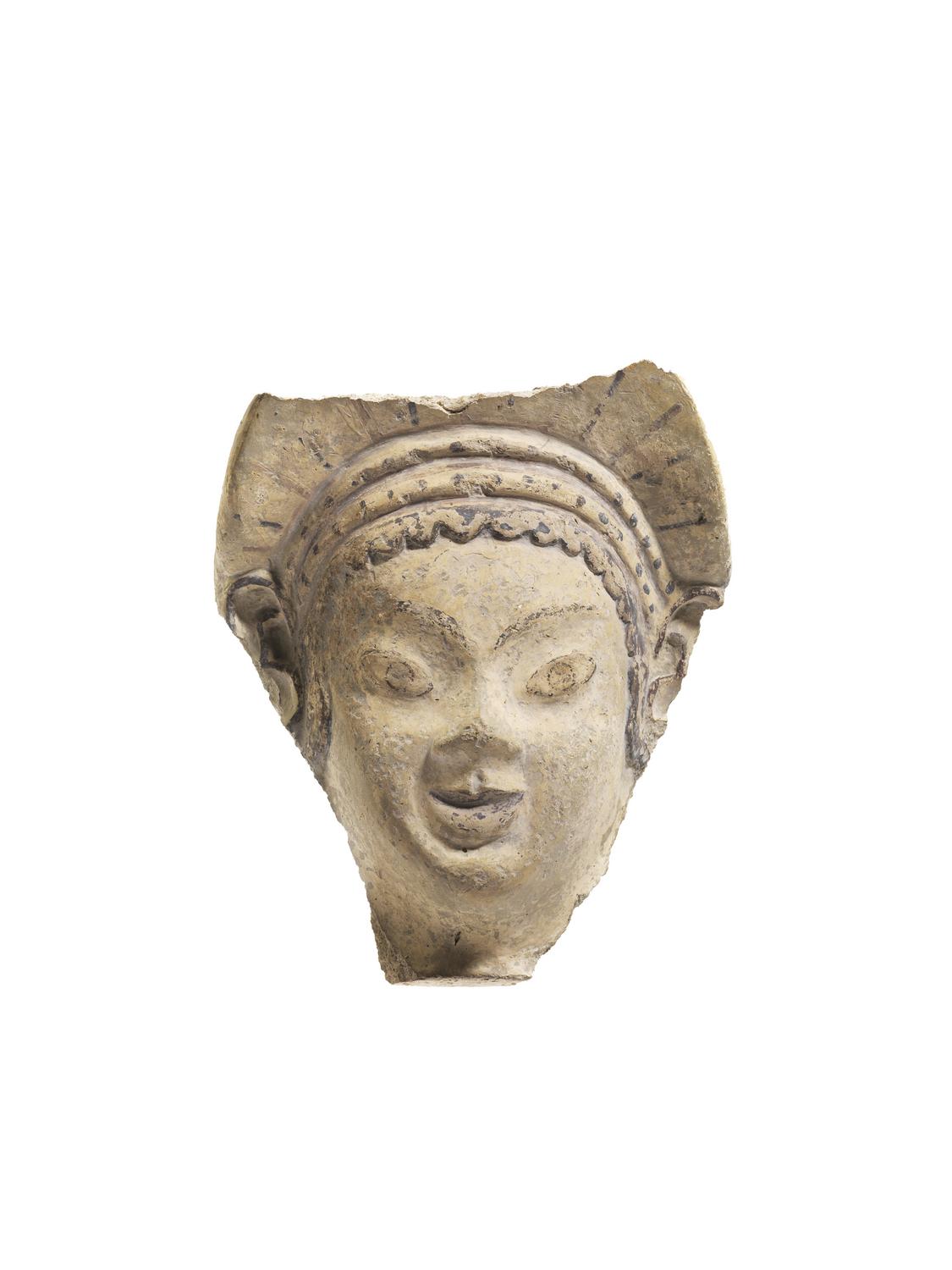 Volto femminile nimbato pertinente con probabilità ad una antefissa; i capelli sono rappresentati a piccole ciocche ed incorniciano la fronte, gli occhi amigdaloidi hanno l'indicazione dipinta delle sopracciglia e delle pupille, il naso è largo e la bocca socchiusa nel sorriso cosiddetto ionico; il piccolo mento pronunciato chiude l'ovale del volto