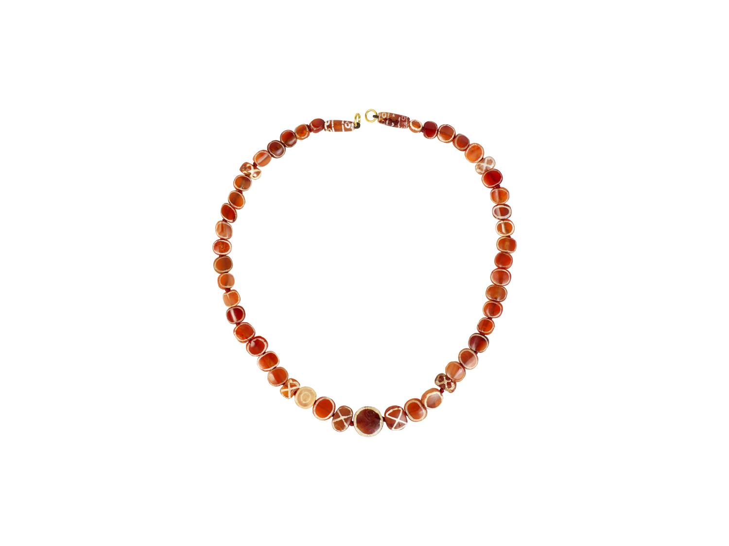 Collana in corniola con vaghi decorati in bianco con l'uso di acidi, tipici dell'artigianato della Valle dell'Indo; chiusura moderna in oro