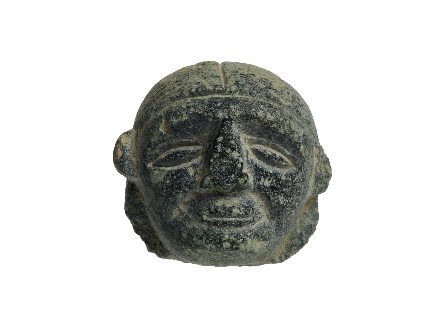 Testa maschile stilizzata con grandi occhi ellittici e grande naso schiacciato, zigomi rilevati e piccola bocca socchiusa, pettinatura a treccine