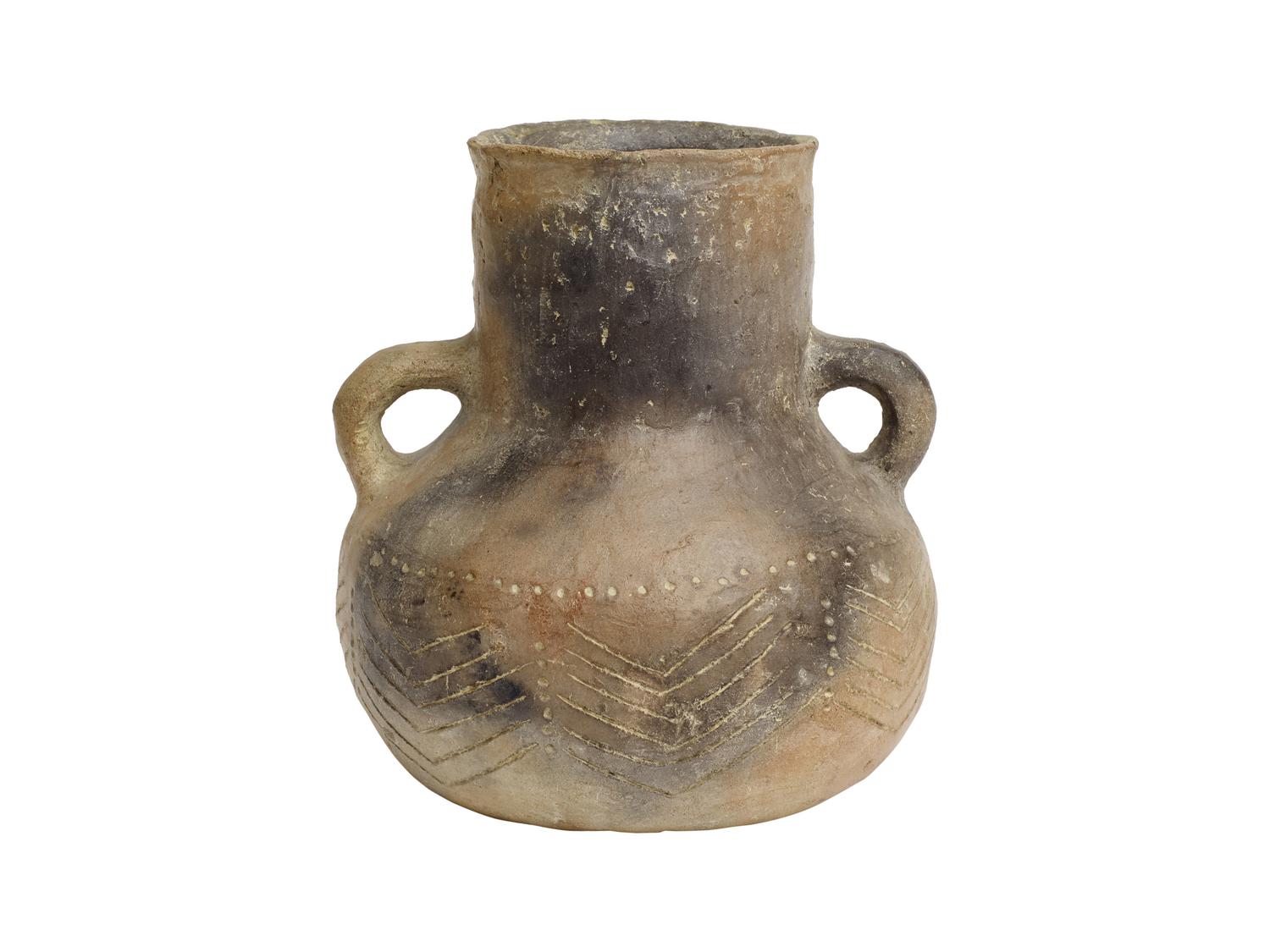 Olla biansata con collo cilindrico e corpo globulare schiacciato, fondo piatto, due piccole anse a bastoncello impostate dal collo alla spalla; decorata ad incisioni geometriche e puntiformi
