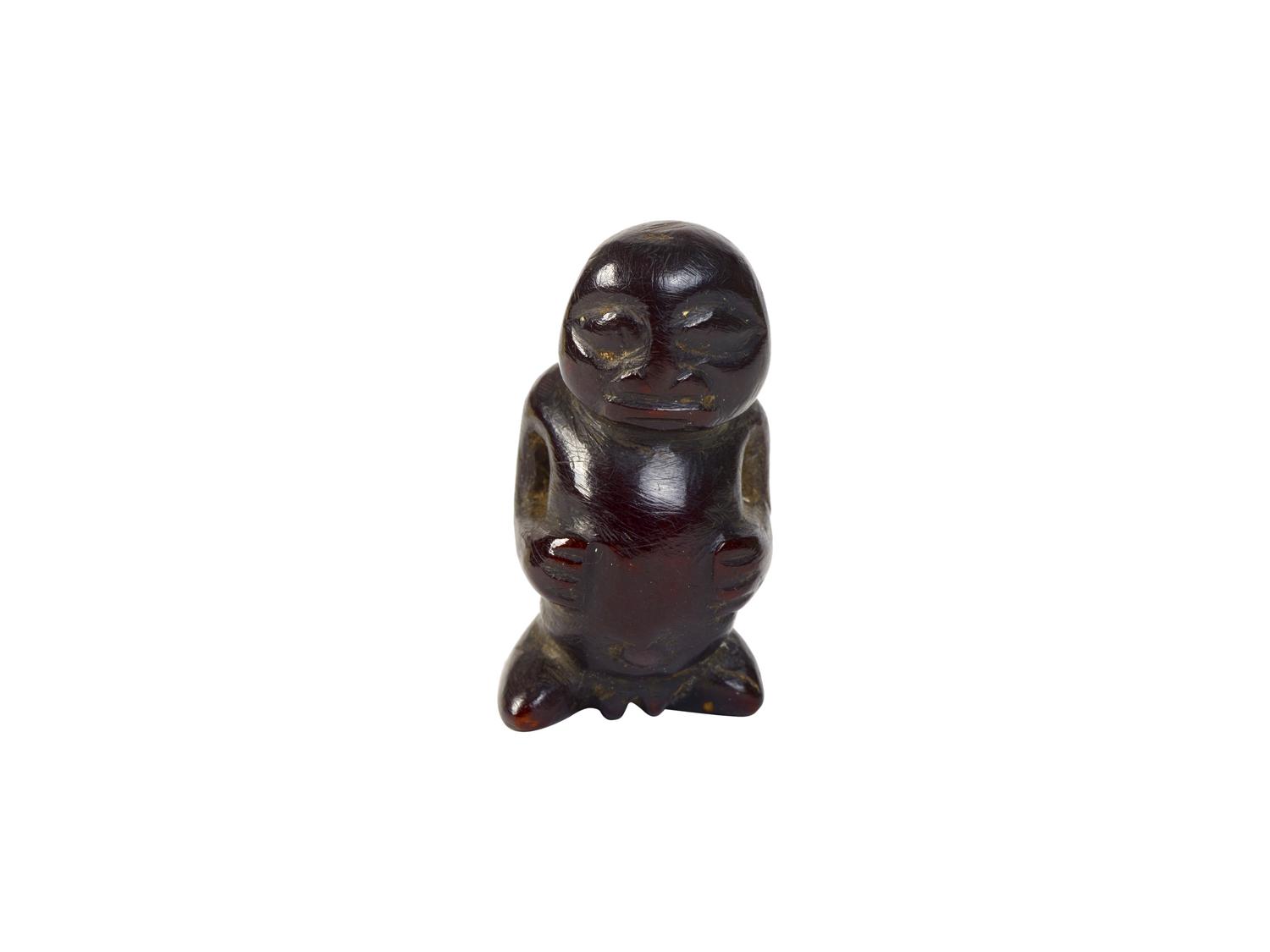 Amuleto antropomorfo maschile raffigurante in modo assai stilizzato un uomo inginocchiato con testa sferica dai grandi occhi, corpo assai pingue, mani portate sul ventre