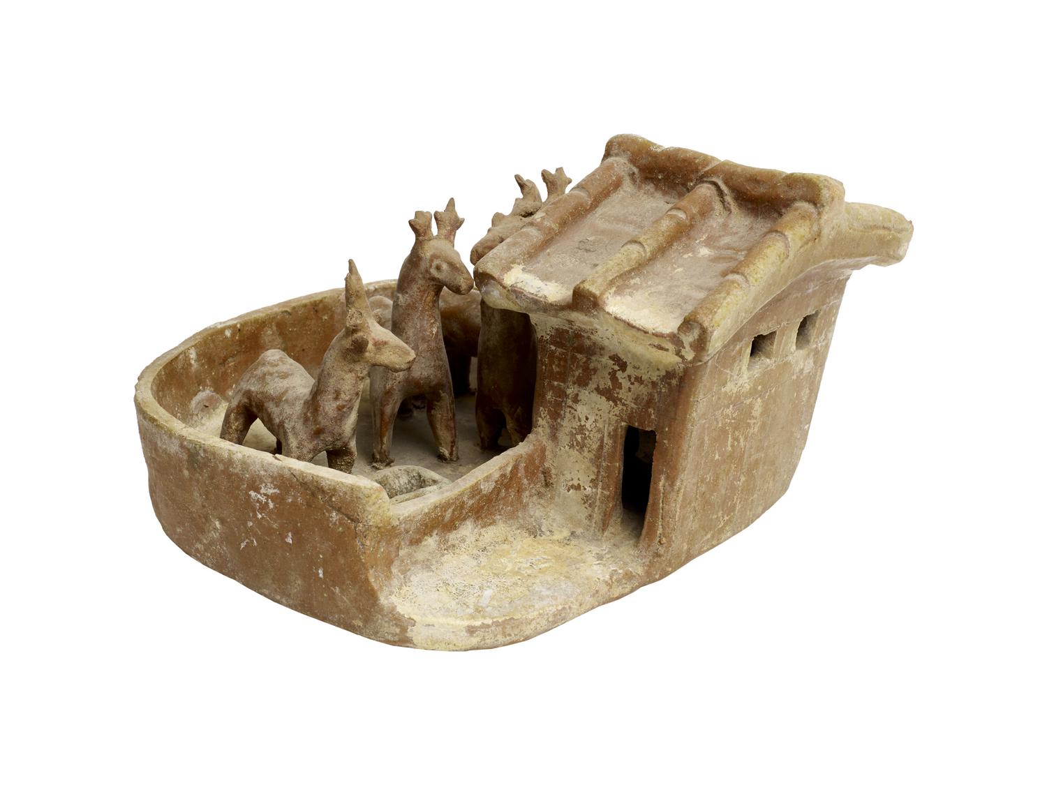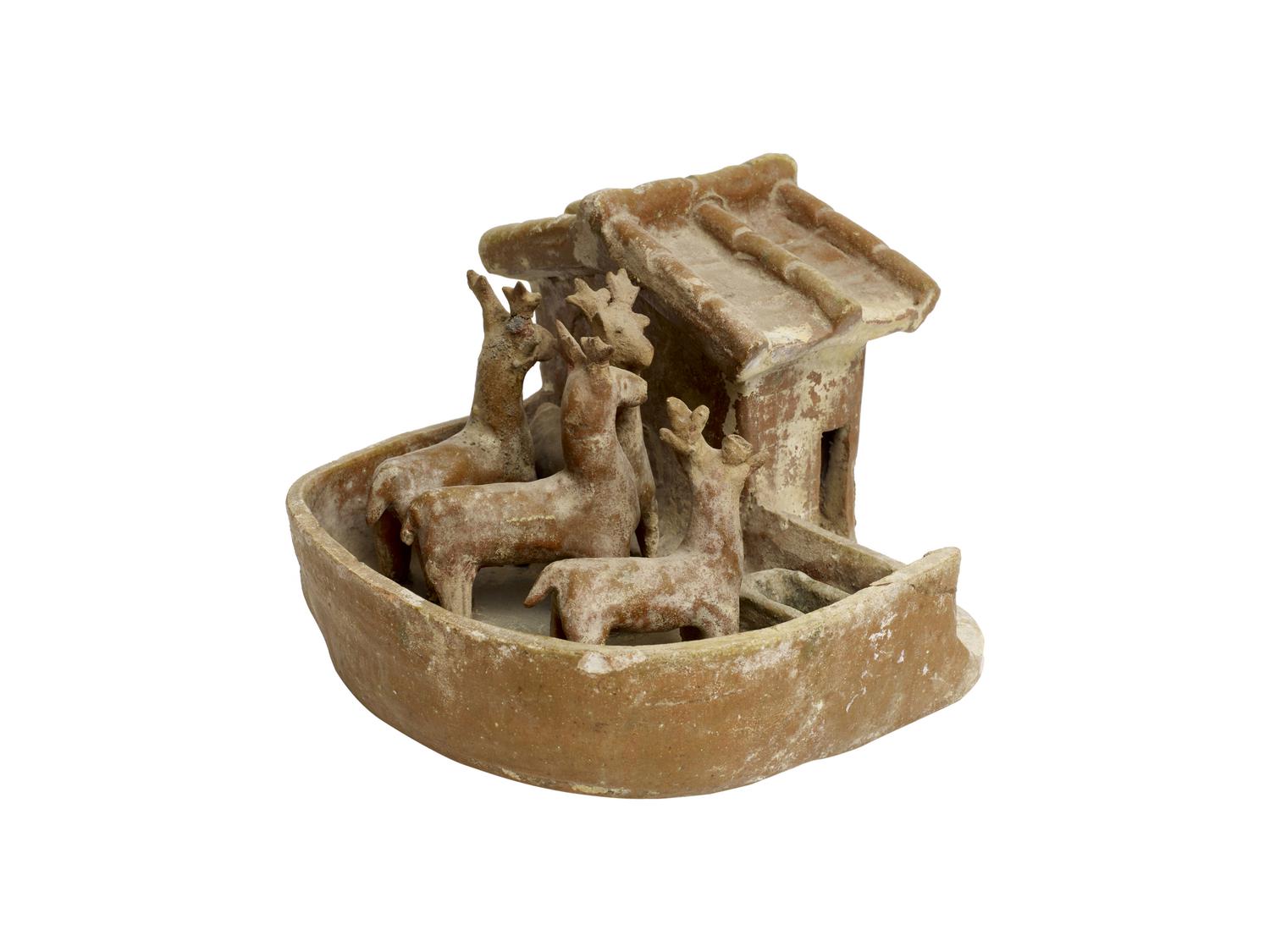 Modello di fattoria in terracotta comprendente una piccola abitazione con tetto coperto da tegole ed embrici ed uno spazio recintato da un muro con quattro cervidi ed una mangiatoia