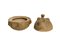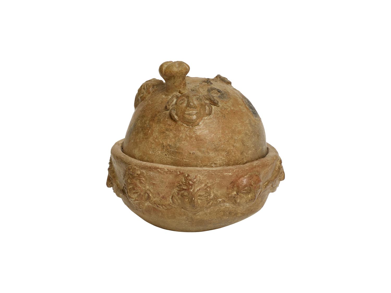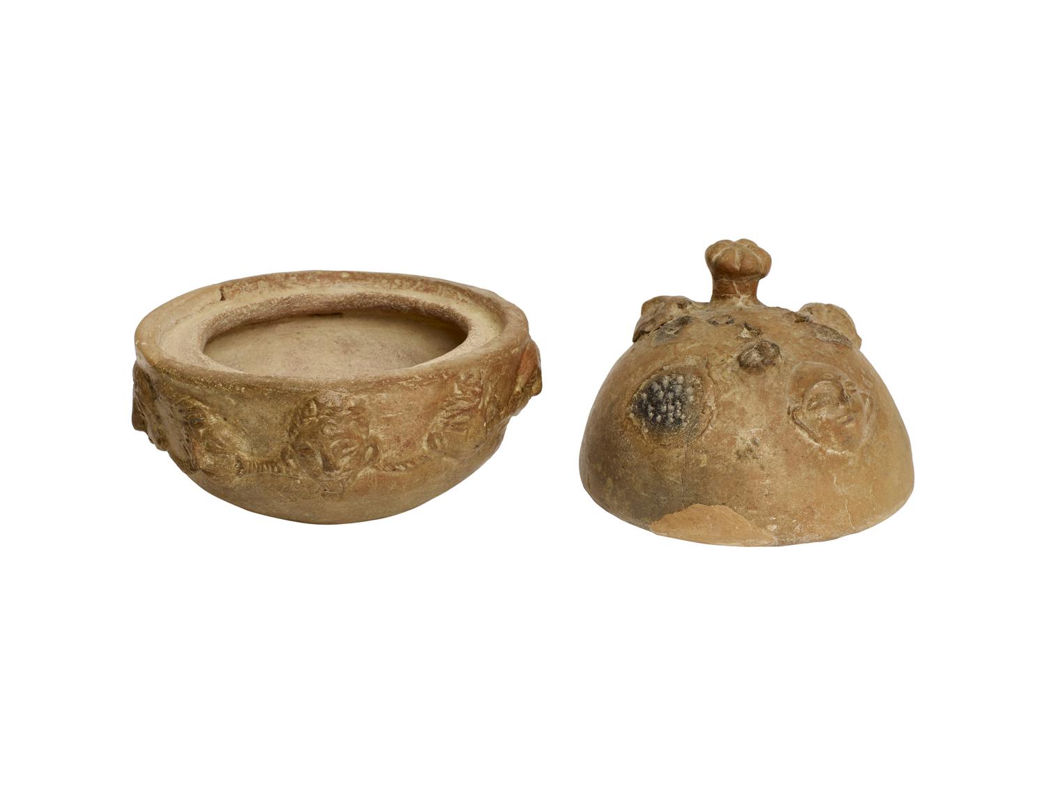 Coppetta emisferica con coperchio con presa a pomello decorati da protomi umane in rilievo