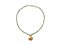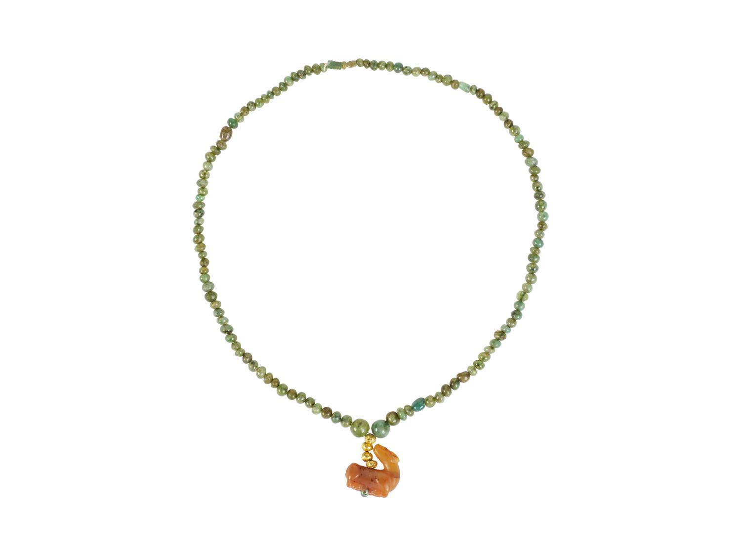 Collana costituita da vaghi sferici in gaideite e pendente in corniola in forma di cerbiatto accosciato con le zampe ripiegate sotto al corpo e testa retrospiciente