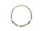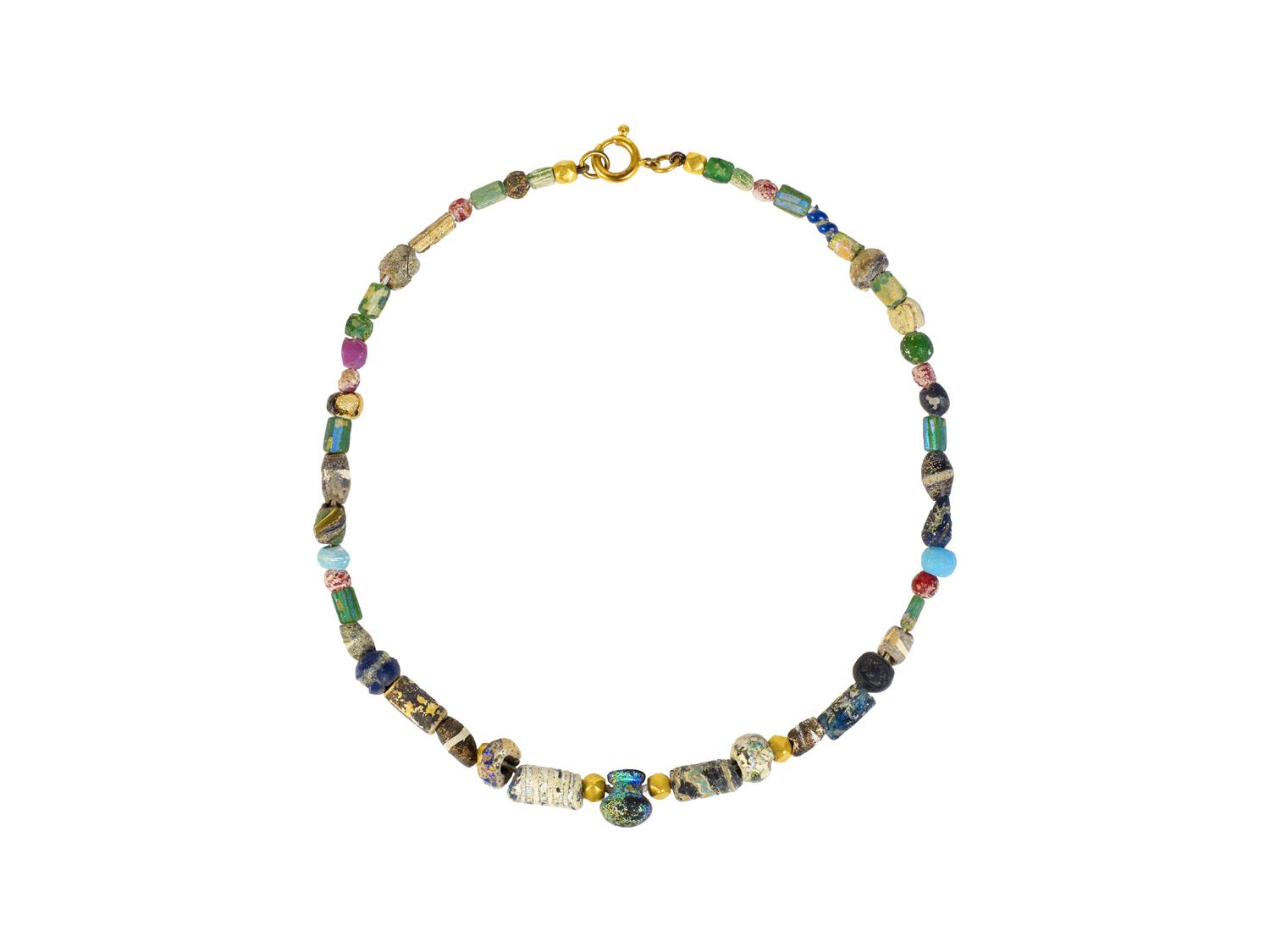 Collana composta da vaghi in vetro di differenti forme e colori e vaghi a murrine e sei vaghi prismatici in oro