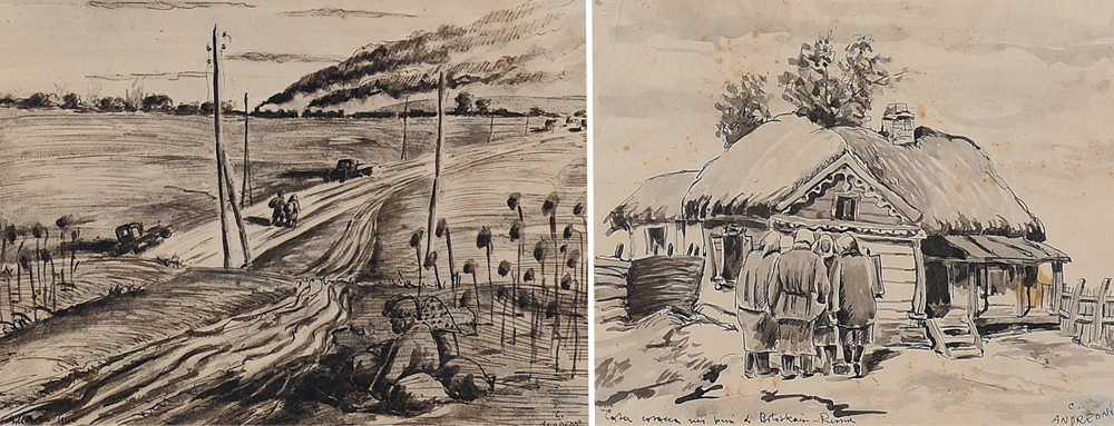 CESARE ANDREONI Milano 1903 - Milano 1961 Casa cosacca nei pressi di Botoskaia, Russia china e acquerello su carta cm. 22,5x28,5; firma in basso a destra, titolo in basso a sinistra. Russia, 1942 china e acquerello su carta cm. 23x33; firma in basso a destra, località illegibile e anno a sinistra.