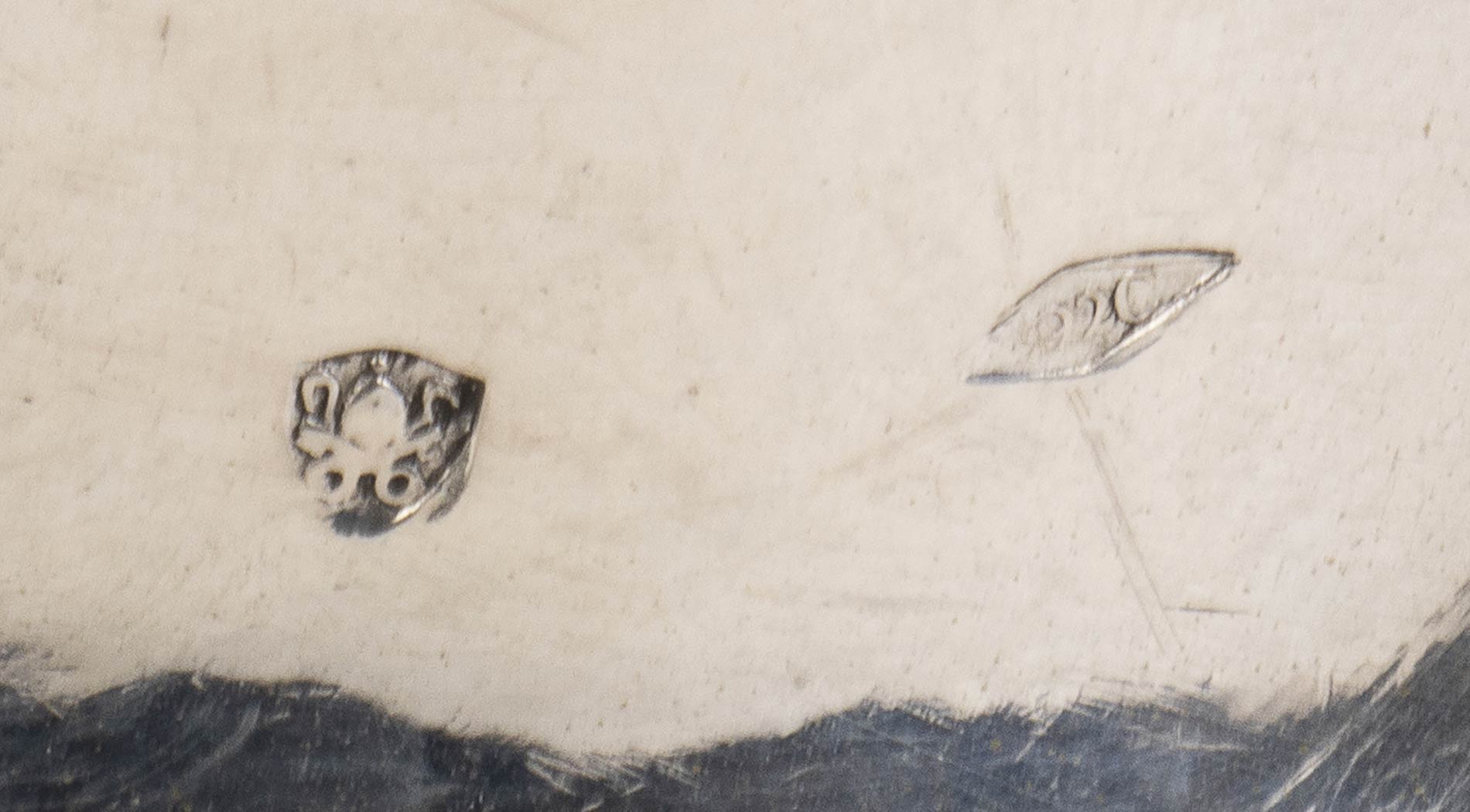 in argento fuso e tornito, corpo liscio con manico a foggia di scultura femminile. Punzonato con i marchi in uso a Roma dopo il 1815 per l'argento al titolo a 10 once e 16 denari (889/1000) e con il marchio dell'argentiere Cappelletti Luigi operante tra il 1839 ed il 1852. Diametro 6 cm, altezza 15,2 cm. Peso 198 gr. Stato di conservazione: **** buono.