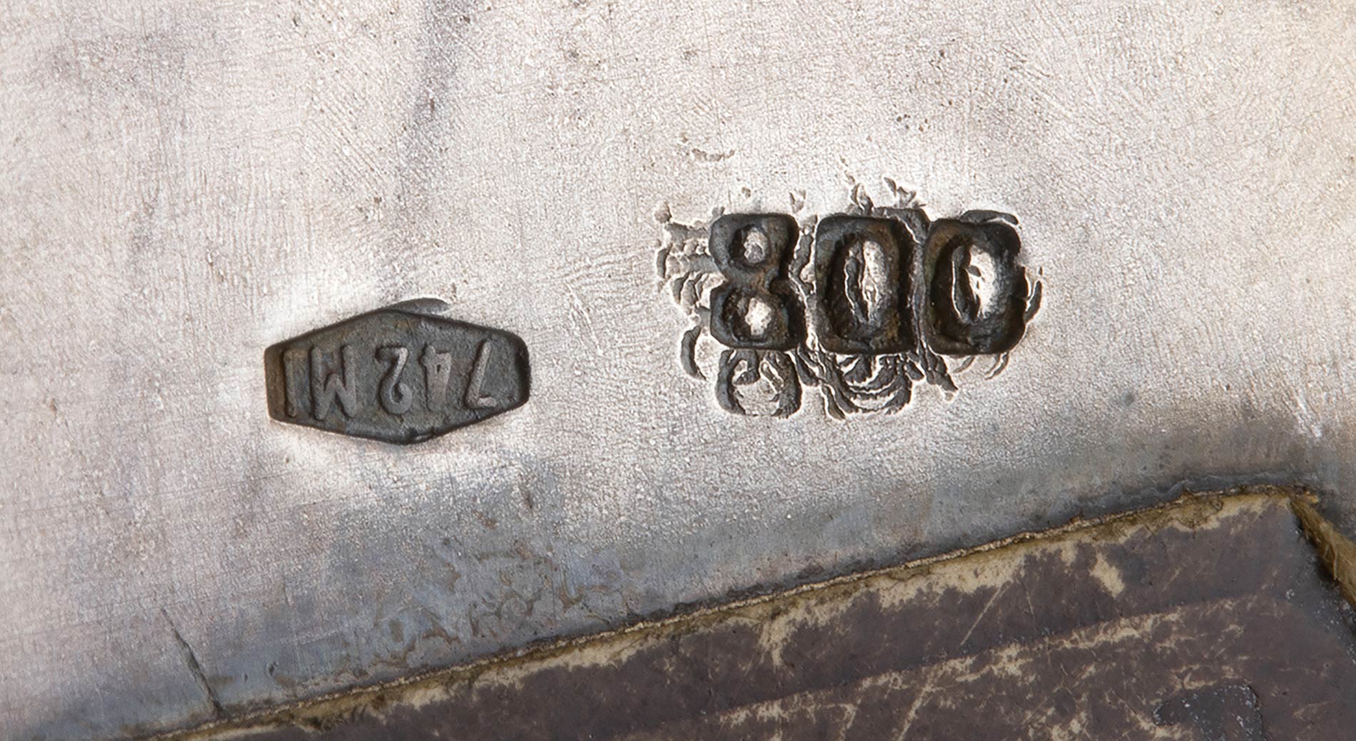 corpo troncoconico sbalzato e cesellato con figure femminili classiche e cani, con coperchio piatto con poggiadito a due ghiande, manico a doppia "s" con terminale a scudo. Punzonato "800", argentiere "742MI" Vallin Adriano. Diametro base 13 cm, altezza 17,5 cm. Peso 992 gr. Stato di conservazione: **** buono.
