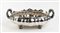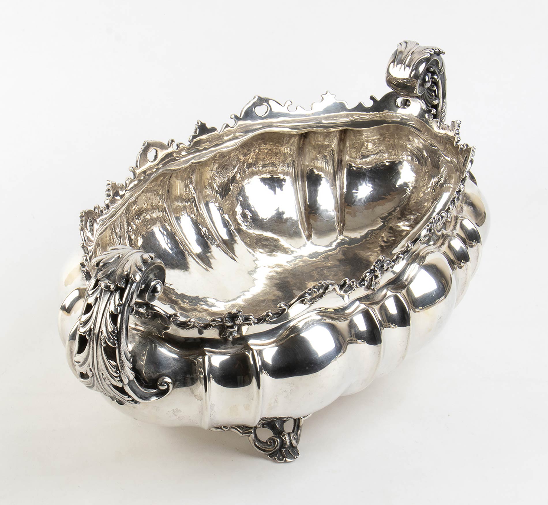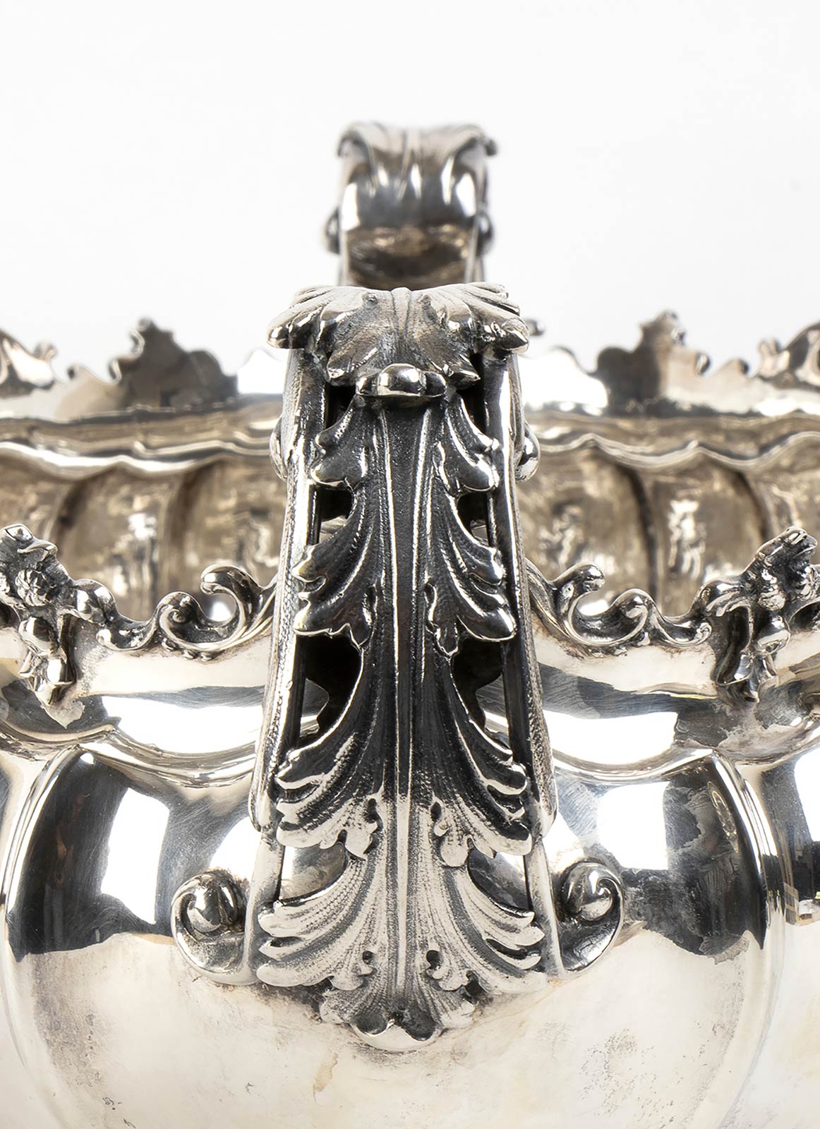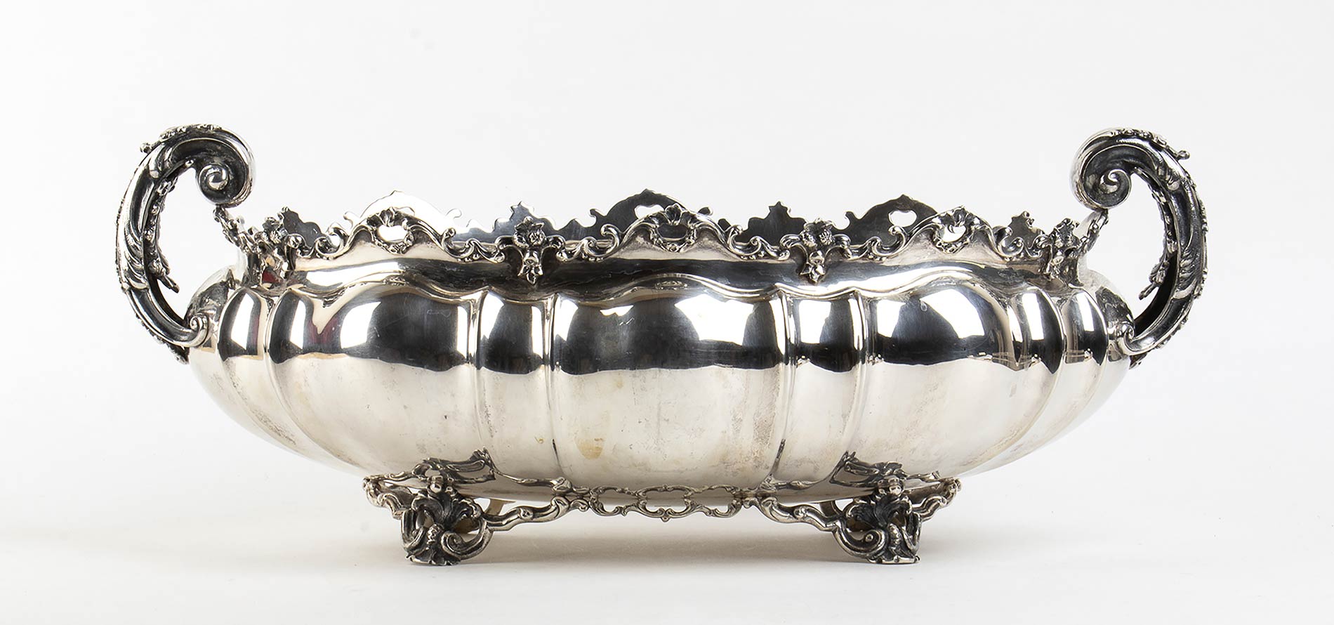 a forma di navicella con bordo mistilineo poggiante su quattro piedini foliati, manici laterali ad ansa foliata. Punzonato "800", argentiere Vespasiani Roma. Dimensioni 24 x 43 cm manici inclusi, altezza 17 cm. Peso 1726 gr. Stato di conservazione: **** buono.