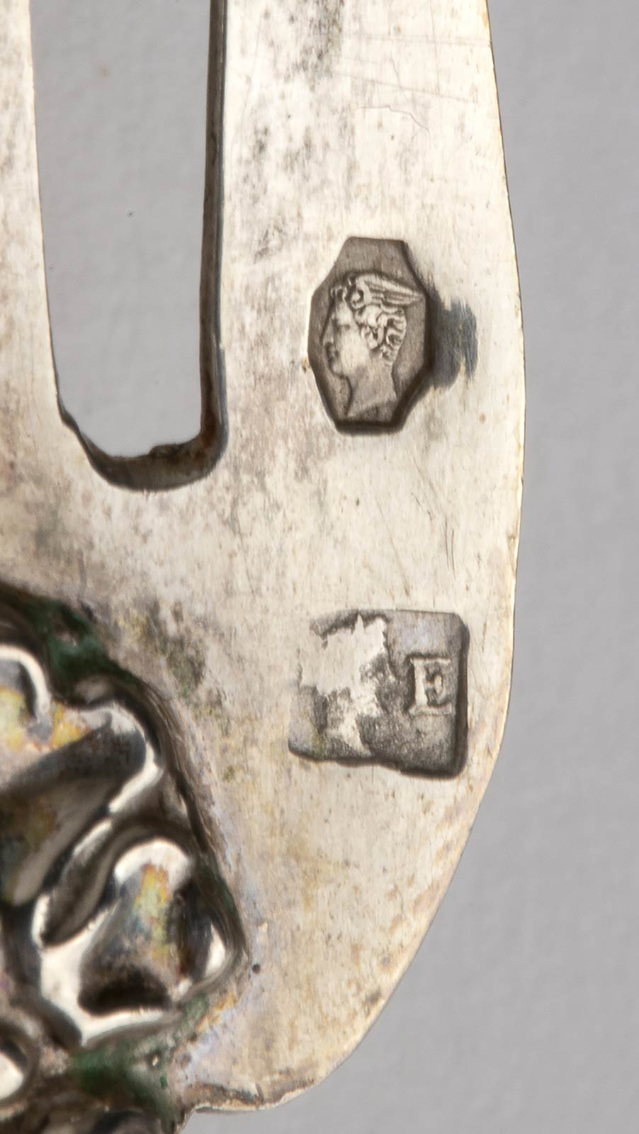 con manici in madreperla. Punzonate con i marchi francesi di esportazione in uso dal 1840 al 1879 e con i marchi di importazione nel Regno delle Sicilie. Lunghezza 13,7 cm. Peso 220 gr. Stato di conservazione: **** buono.