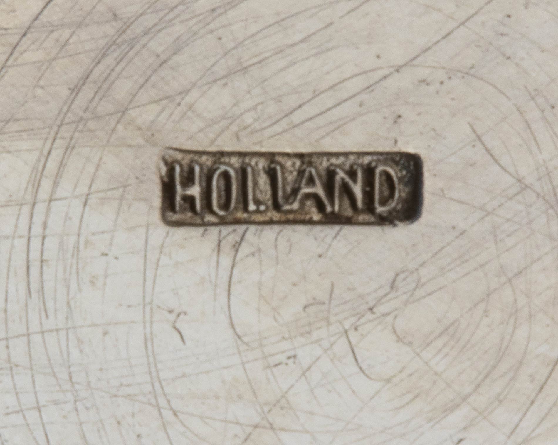 di forma ovale traforati a motivi geometrici. Serie completa di marchi olandesi in uso dal 1953. Dimensioni 15 x 9 cm, altezza 6,2 cm. Peso 166 gr. Stato di conservazione: **** buono.