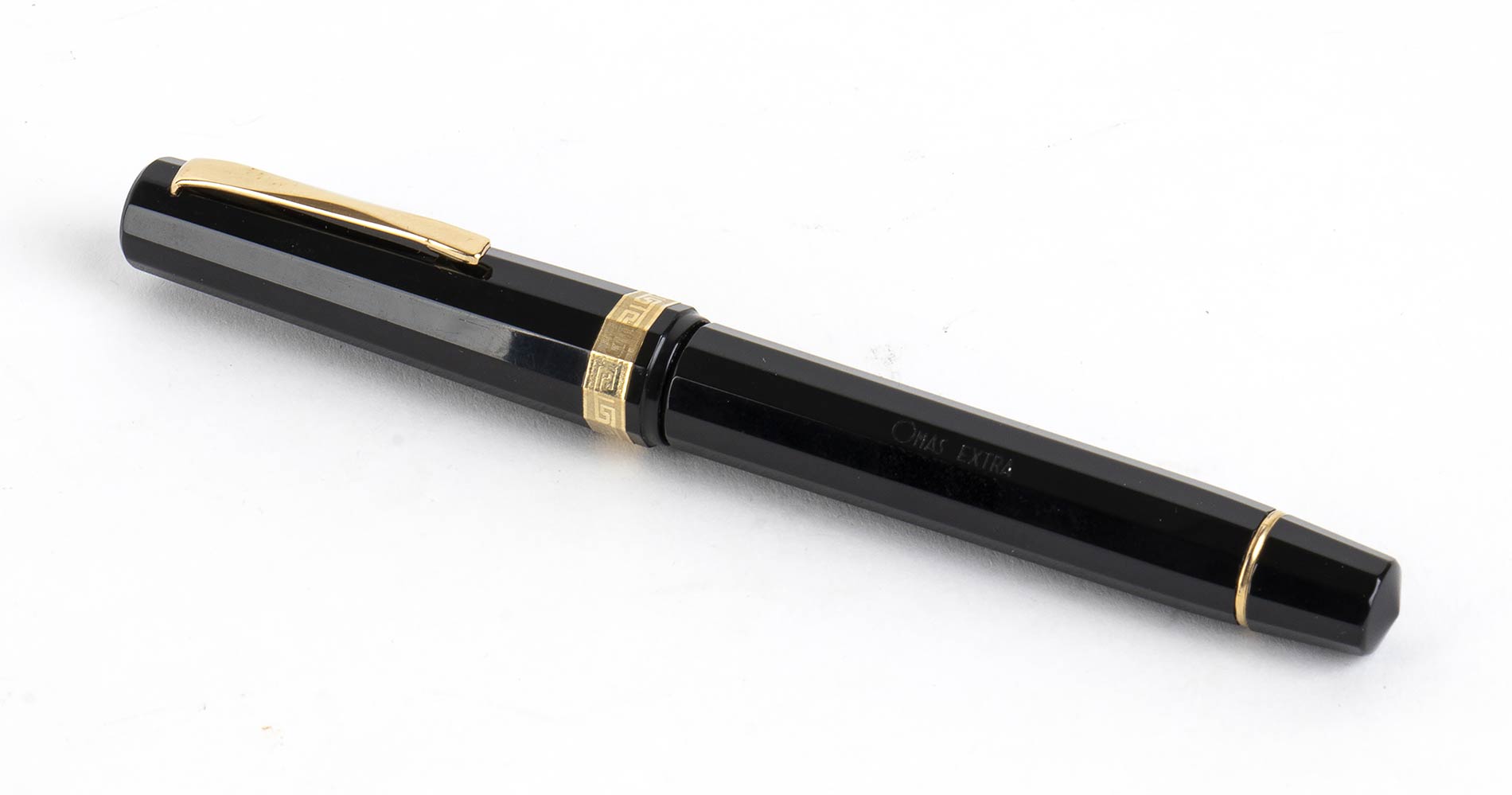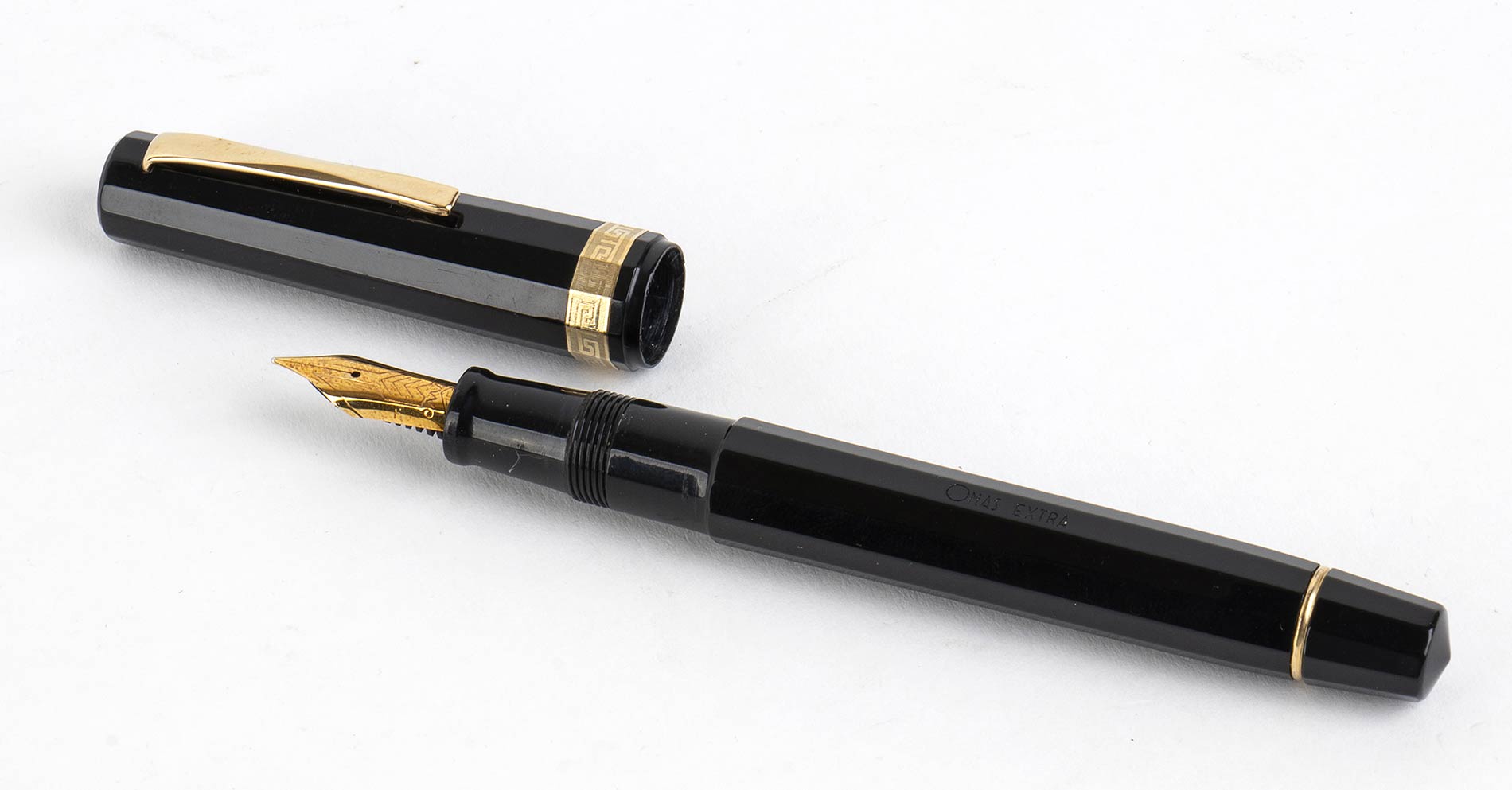 fusto e cappuccio in celluloide nera con finiture placcate in oro marcato "OMAS EXTRA" ed il pennino riporta la dicitura "OMAS 750". Il sistema di caricamento è a stantuffo. Lunghezza 13,4 cm. Stato di conservazione: **** buono, la celluloide è ancora in buone condizioni e non è stata lucidata, la clip originale e la banda sul cappuccio sono in buone condizioni. Scatola e controscatola OMAS con documenti originali. La penna non è stata testata, e anche se sembra funzionante potrebbe necessitare di una piccola revisione.