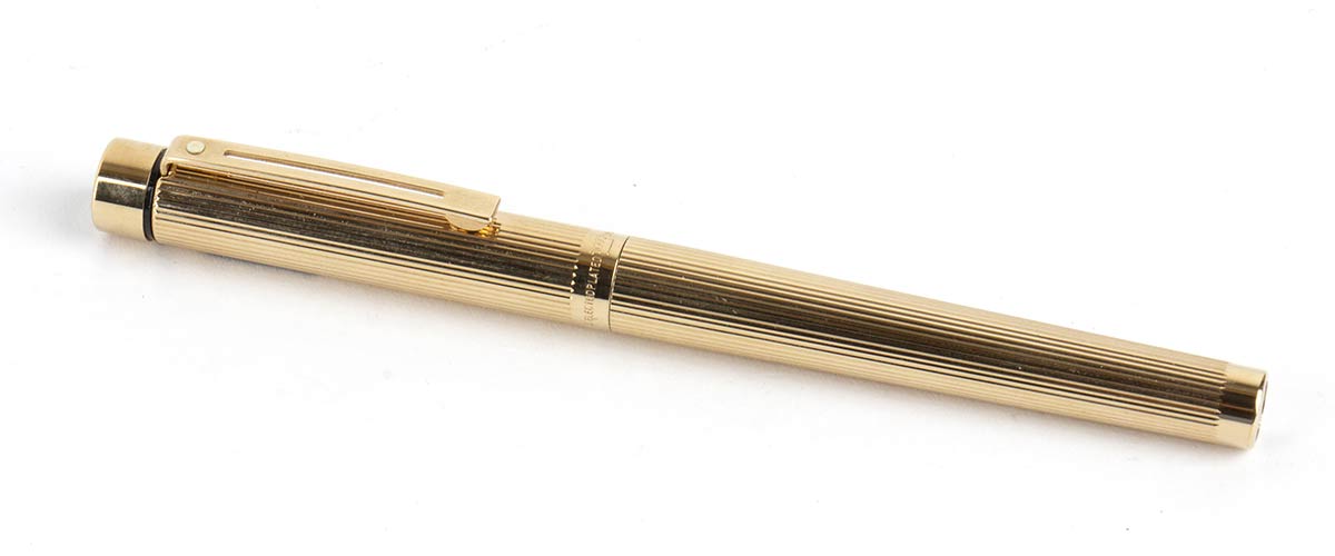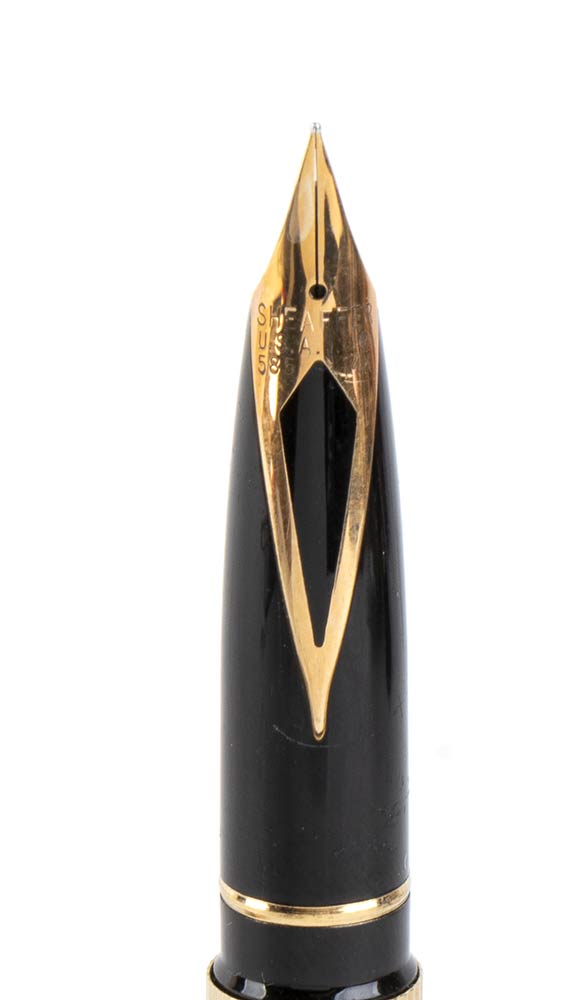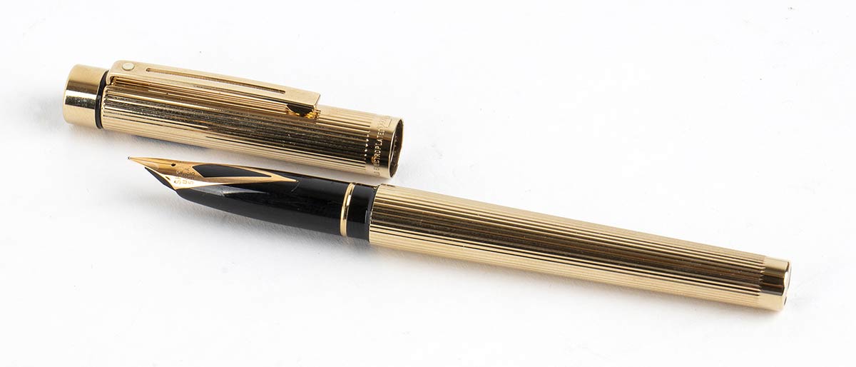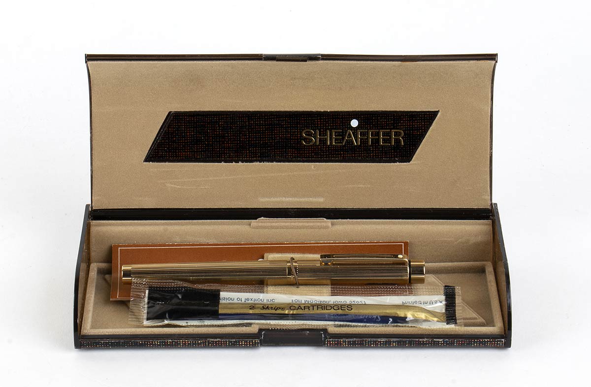 fusto e cappuccio placcati in oro, il cappuccio marcato "GOLD ELECTRO PLATED SHEAFFER US.A. ed il pennino riporta la dicitura "SHEAFFER U.S.A. 585 14K." Lunghezza 13. 5 cm. Stato di conservazione: ****° nuova. Scatola Sheffler con documenti originali.