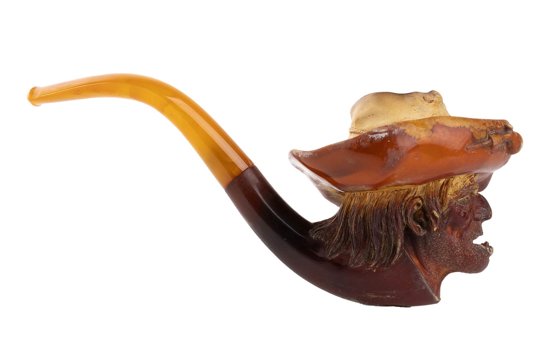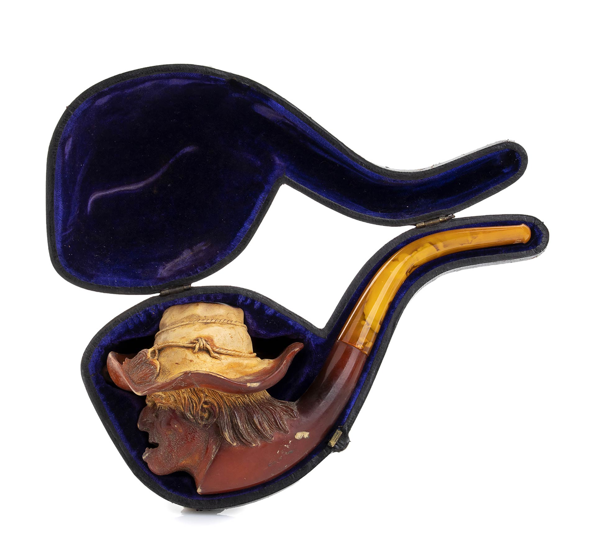 scolpita con una testa di personaggio maschile, bocchino in ambra. Con custodia. Lunghezza 15 cm. Stato di conservazione: **** buono.