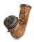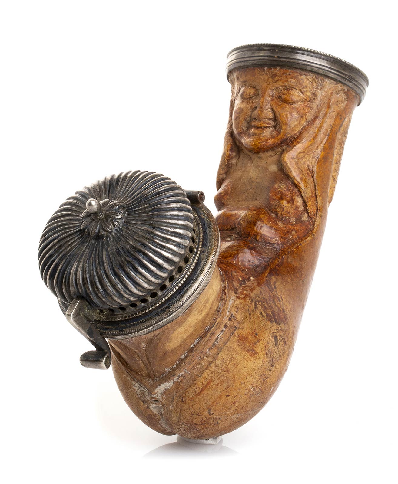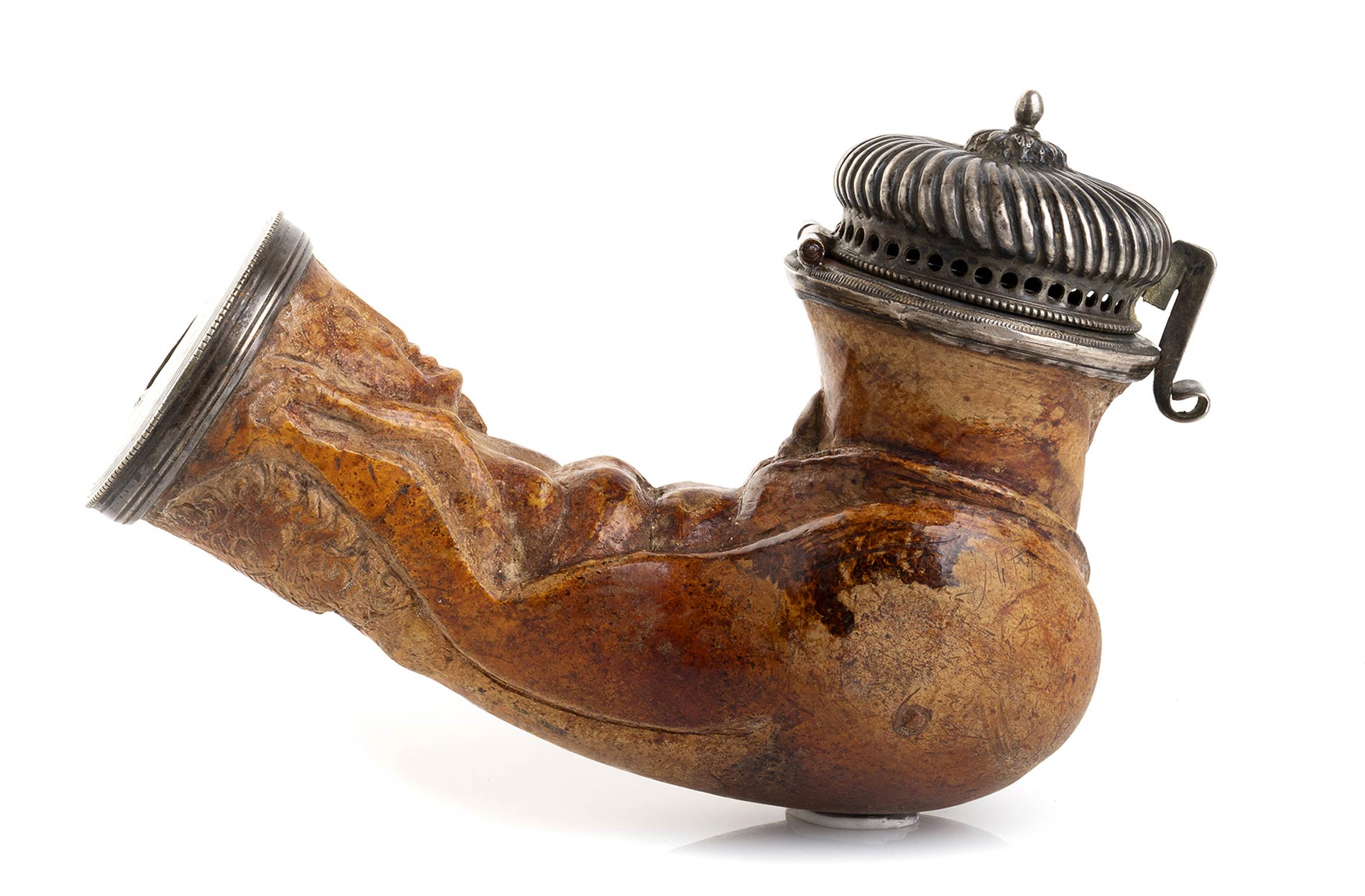 fornello in schiuma di mare, soggetto erotico, coperchio in metallo. Lunghezza 13 cm. Stato di conservazione: **** quasi buono (bocchino mancante).