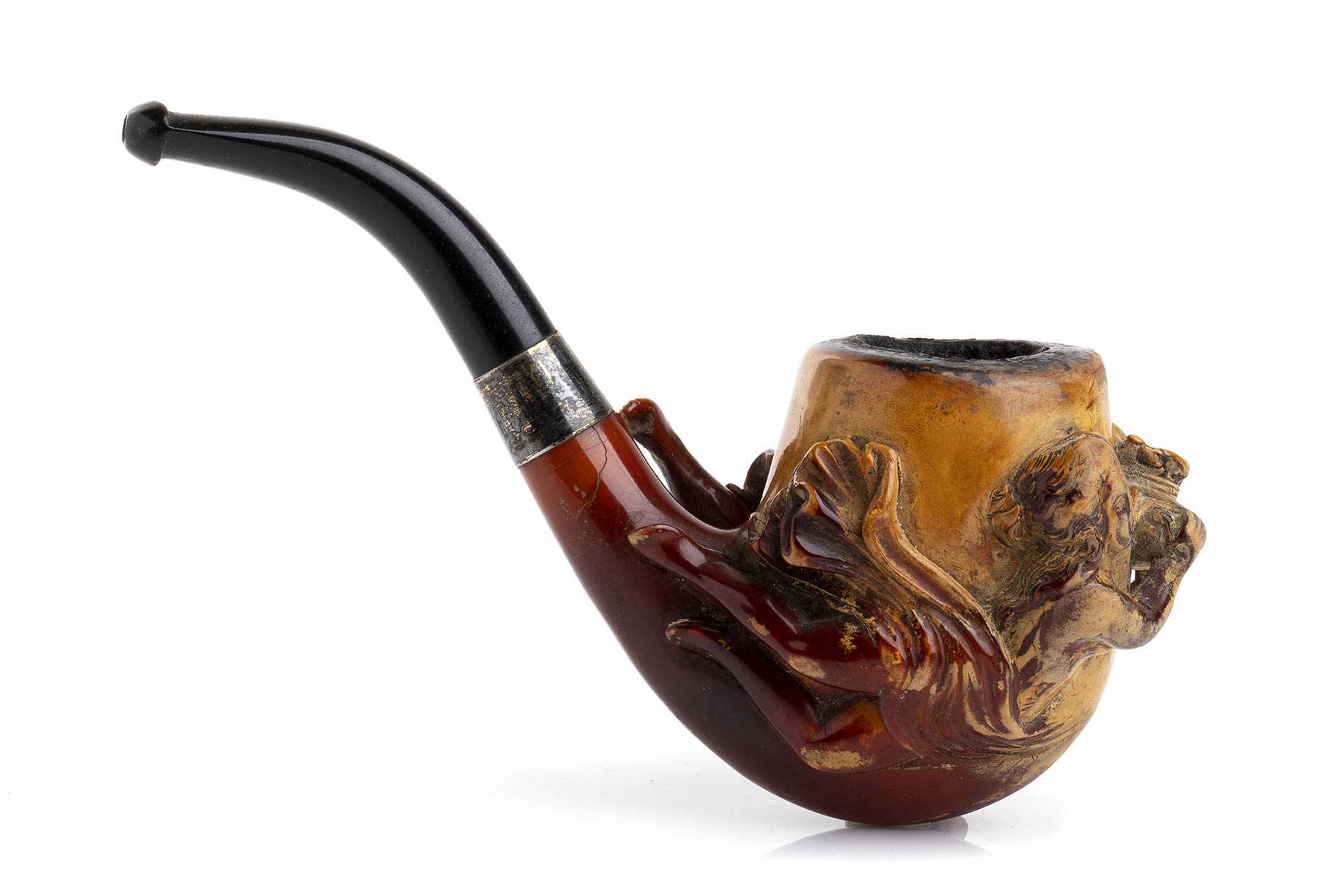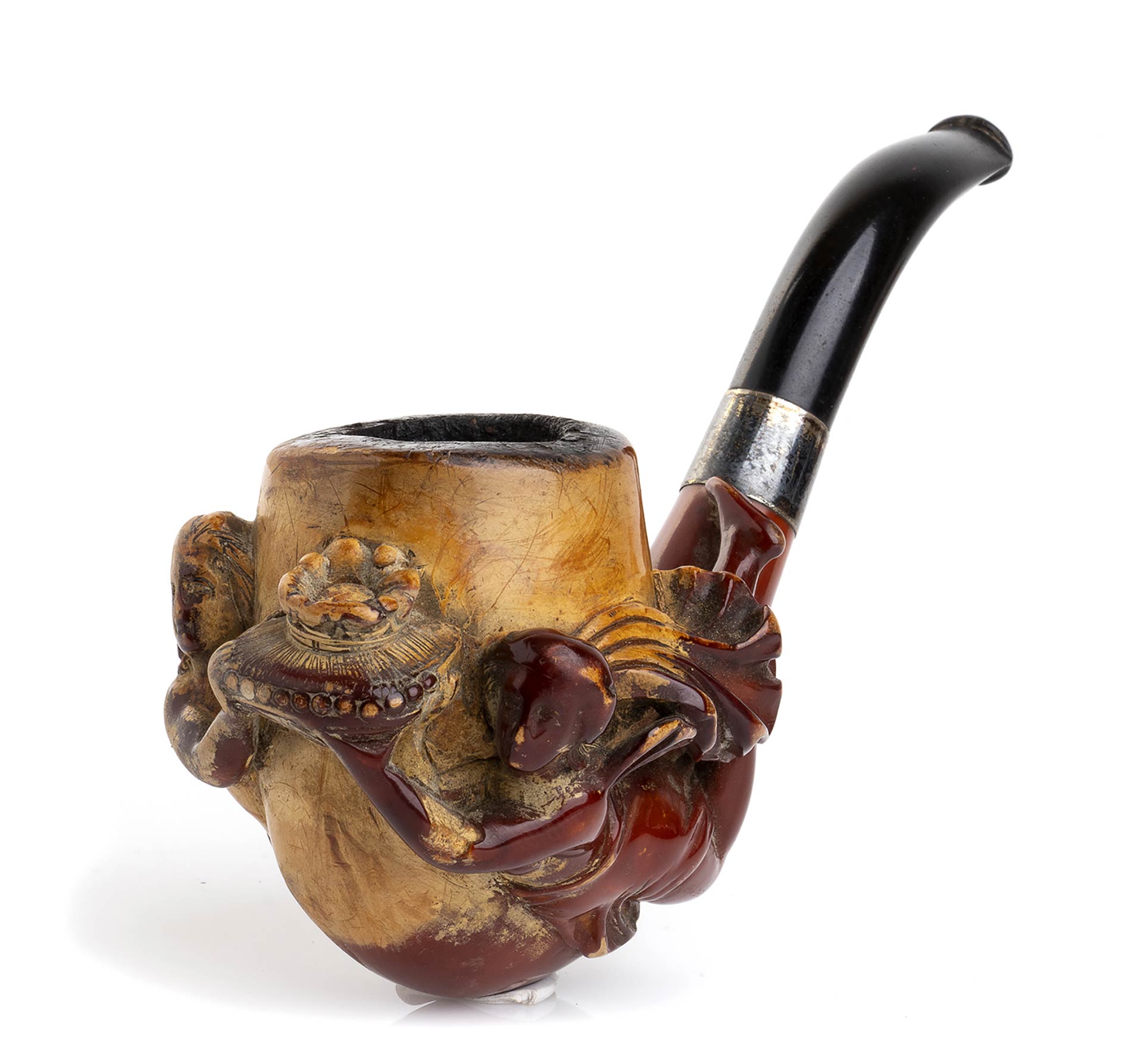 scolpita con due figure che sorreggono una corona. Lunghezza 13 cm. Stato di conservazione: **** quasi buono (bocchino mancante).