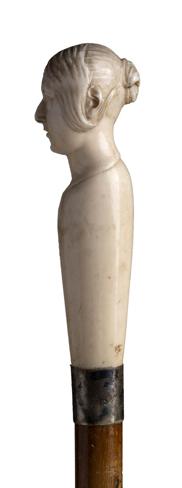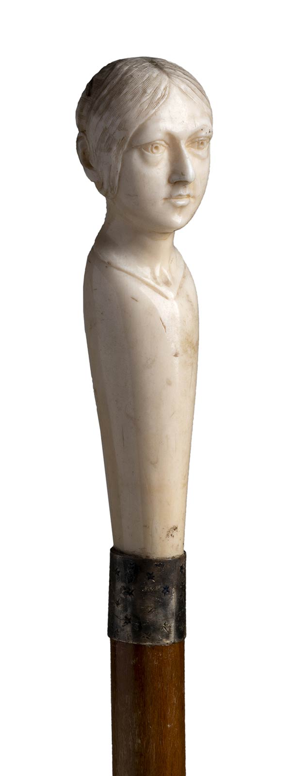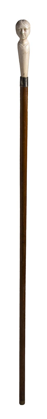 impugnatura verticale in avorio di elefante scolpita con testa di donna. Asta in legno chiaro, collarino in metallo decorato. Peso 200 gr, altezza 86,5 cm. Stato di conservazione: **** buono. Certificato di Antichità Ce.S.Ar. (pre-1947).