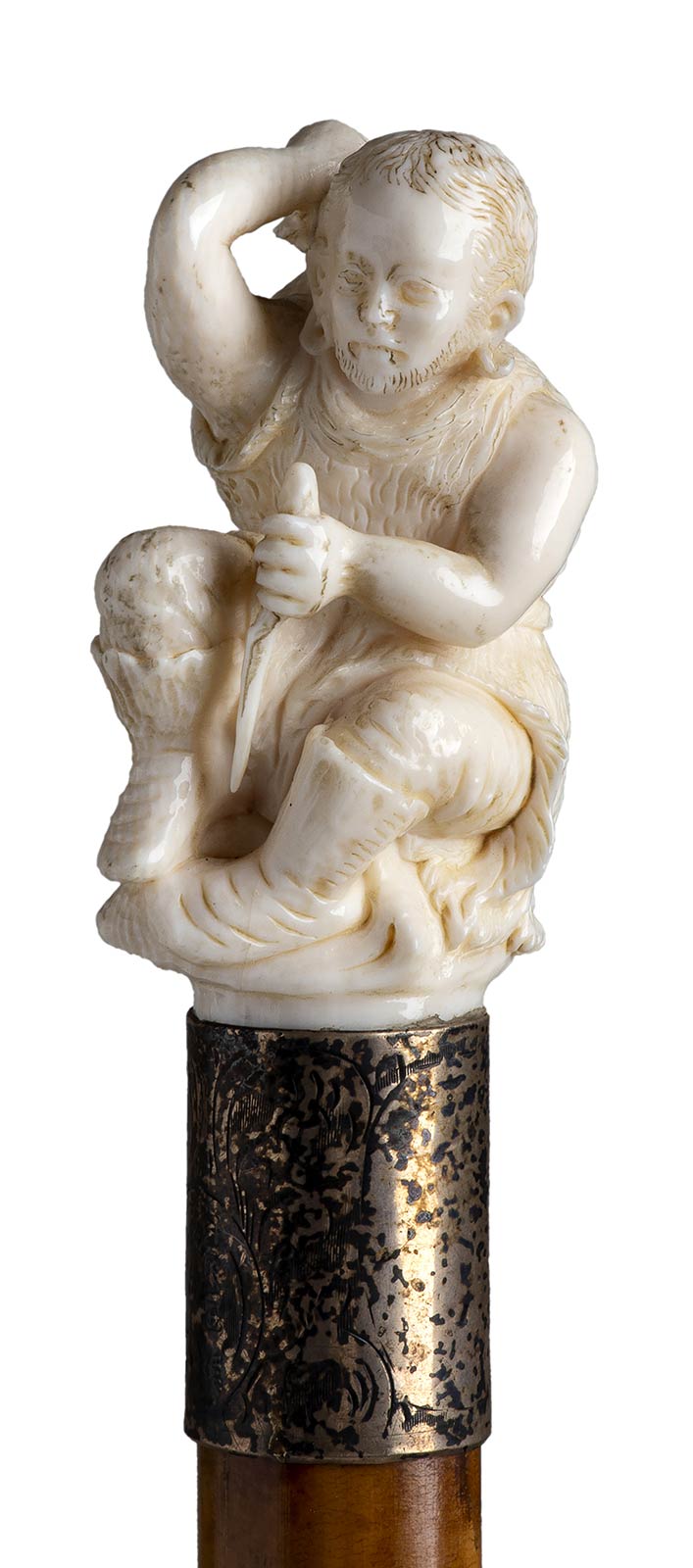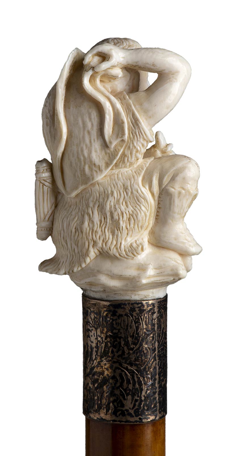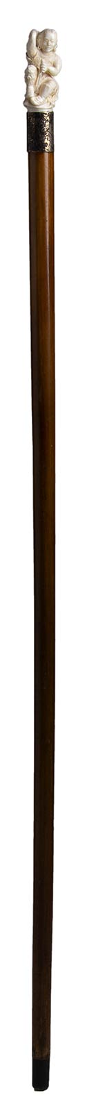 impugnatura verticale in avorio di elefante scolpita con cacciatore. Asta in malacca, collarino in argento 925/1000 punzonato Birmingham 1921-22, argentiere "TH" e puntale in legno. Peso 232 gr, altezza 90,5 cm. Stato di conservazione: **** buono. Certificato di Antichità Ce.S.Ar. (pre-1947).