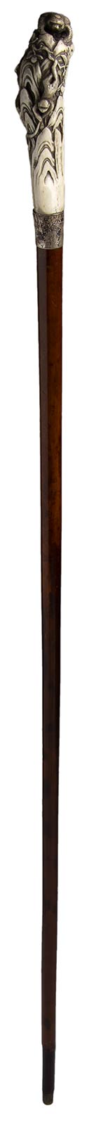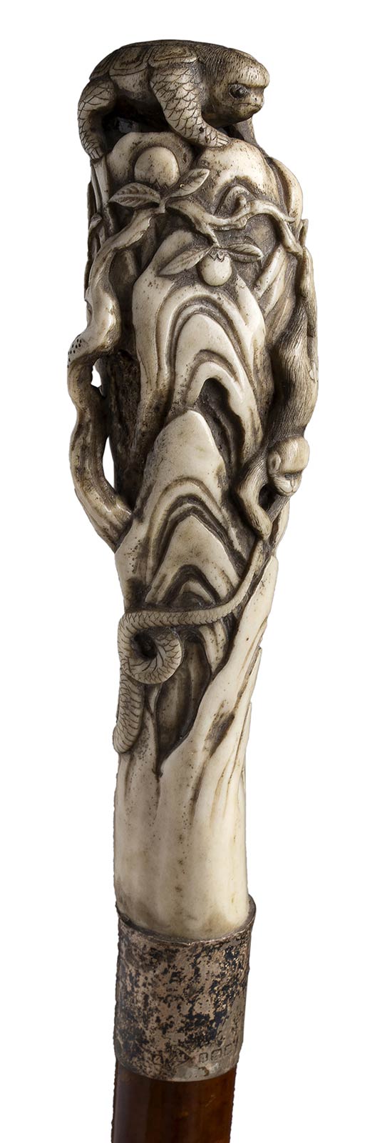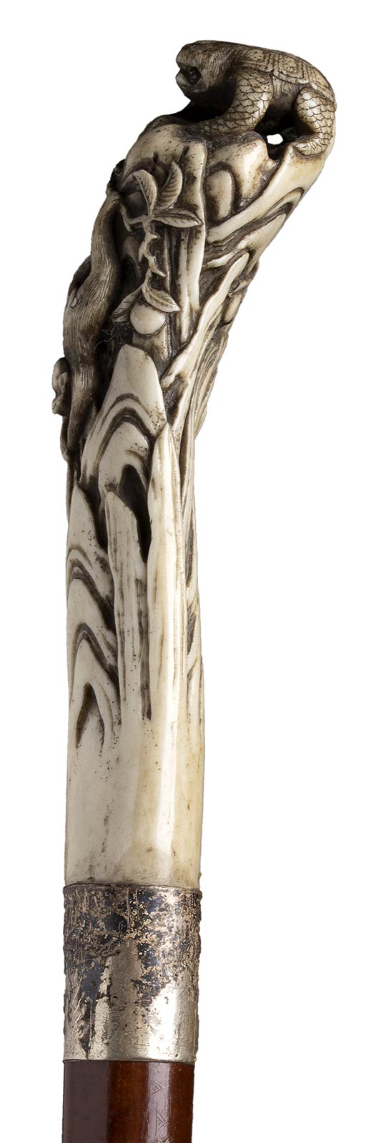 impugnatura giapponese verticale in osso scolpita con rana, scimmia e serpente posti su un tronco d'albero. Asta in malacca, collarino in argento 925/1000 inciso con stilemi floreali e punzonato Londra 1916-17. Peso 214 gr, altezza 102 cm. Stato di conservazione: **** quasi buono (puntale assente).