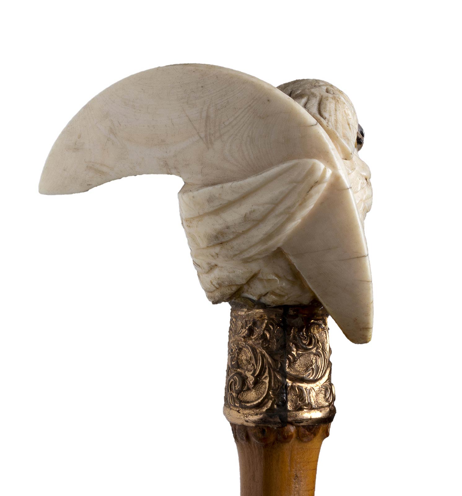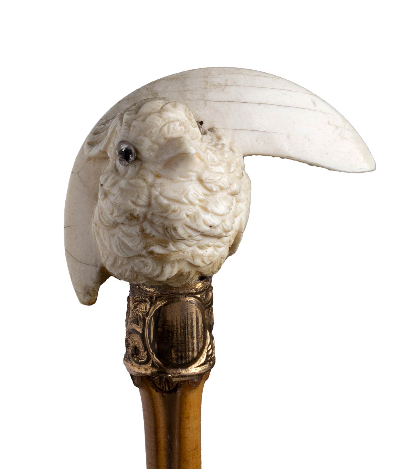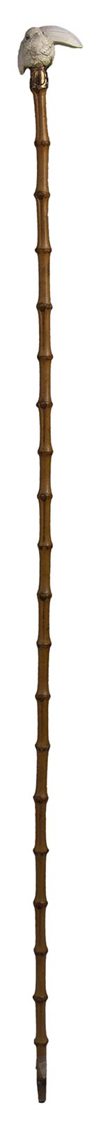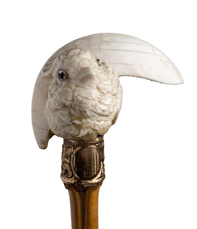 impugnatura in avorio di elefante scolpita con uccellino. Asta in bamboo, collarino in metallo dorato decorato con stilemi vegetali e puntale in metallo. Peso 73 gr, altezza 87,5 cm. Stato di conservazione: **** buono. Certificato di Antichità Ce.S.Ar. (pre-1947).