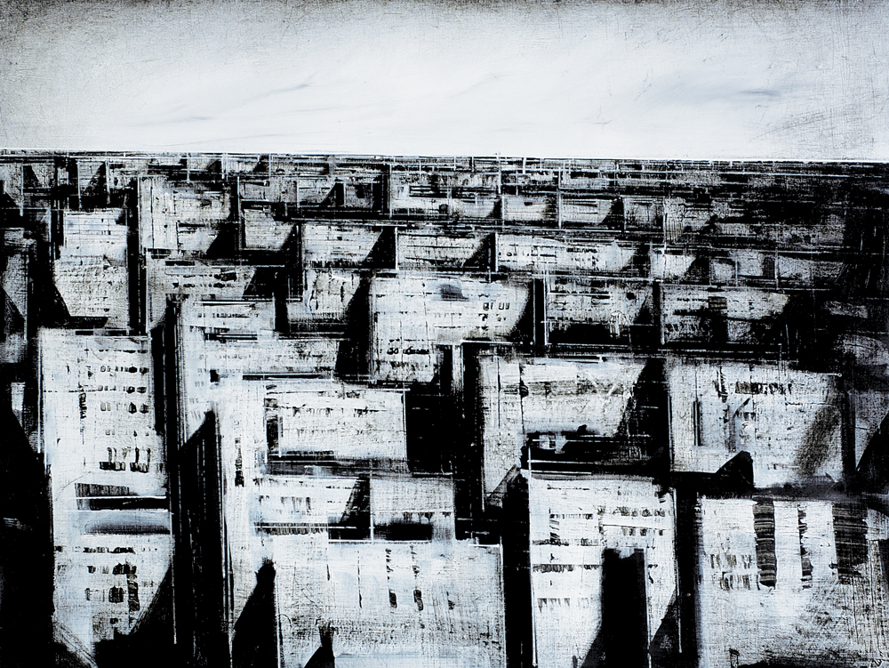 JONATHAN GUAITAMACCHI Londra 1961 Metropoli 3, 2003 olio su carta applicata su tela cm. 60x80, titolo, firma e anno al retro, dichiarazione d'autenticità dell'artista e timbro della Galleria La Spirale (MI) su foto.