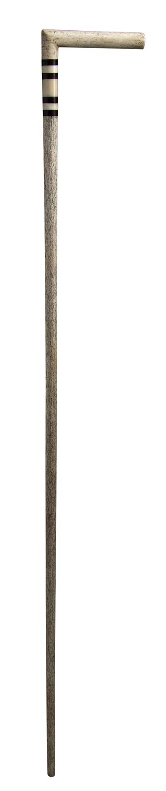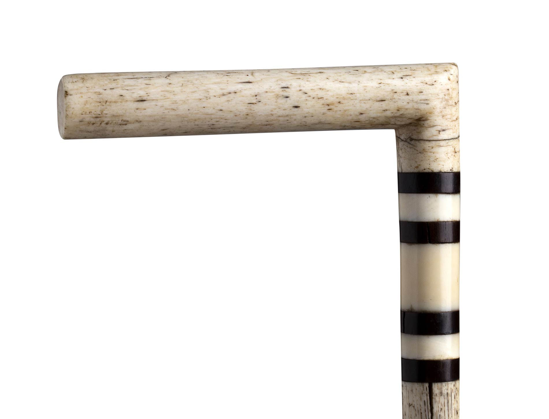 impugnatura ad "L" liscia in osso di balena, asta intera in osso di balena, collarino in avorio marino ed ebano. Le aste in ossa di balena provengono prevalentemente dai porti della costa orientale degli Stati Uniti e da porti britannici come Whitby, Hull e Leith. Peso 305 gr, altezza 91 cm. Stato di conservazione: **** buono. Certificato di Antichità Ce.S.Ar. (pre-1947).