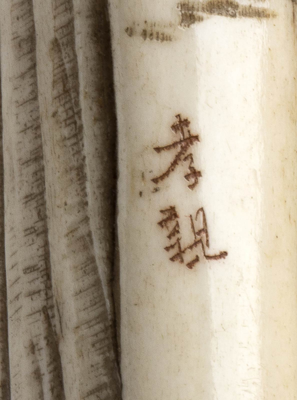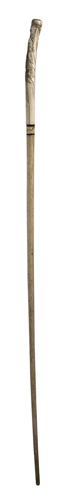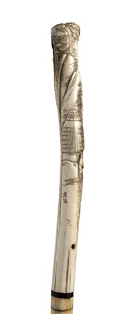 impugnatura giapponese verticale in osso scolpito con un paesaggio, asta intera in osso di balena, collarino in ebano. Le aste in ossa di balena provengono prevalentemente dai porti della costa orientale degli Stati Uniti e da porti britannici come Whitby, Hull e Leith. Peso 246 gr, altezza 91 cm. Stato di conservazione:**** buono. Certificato di Antichità Ce.S.Ar. (pre-1947).