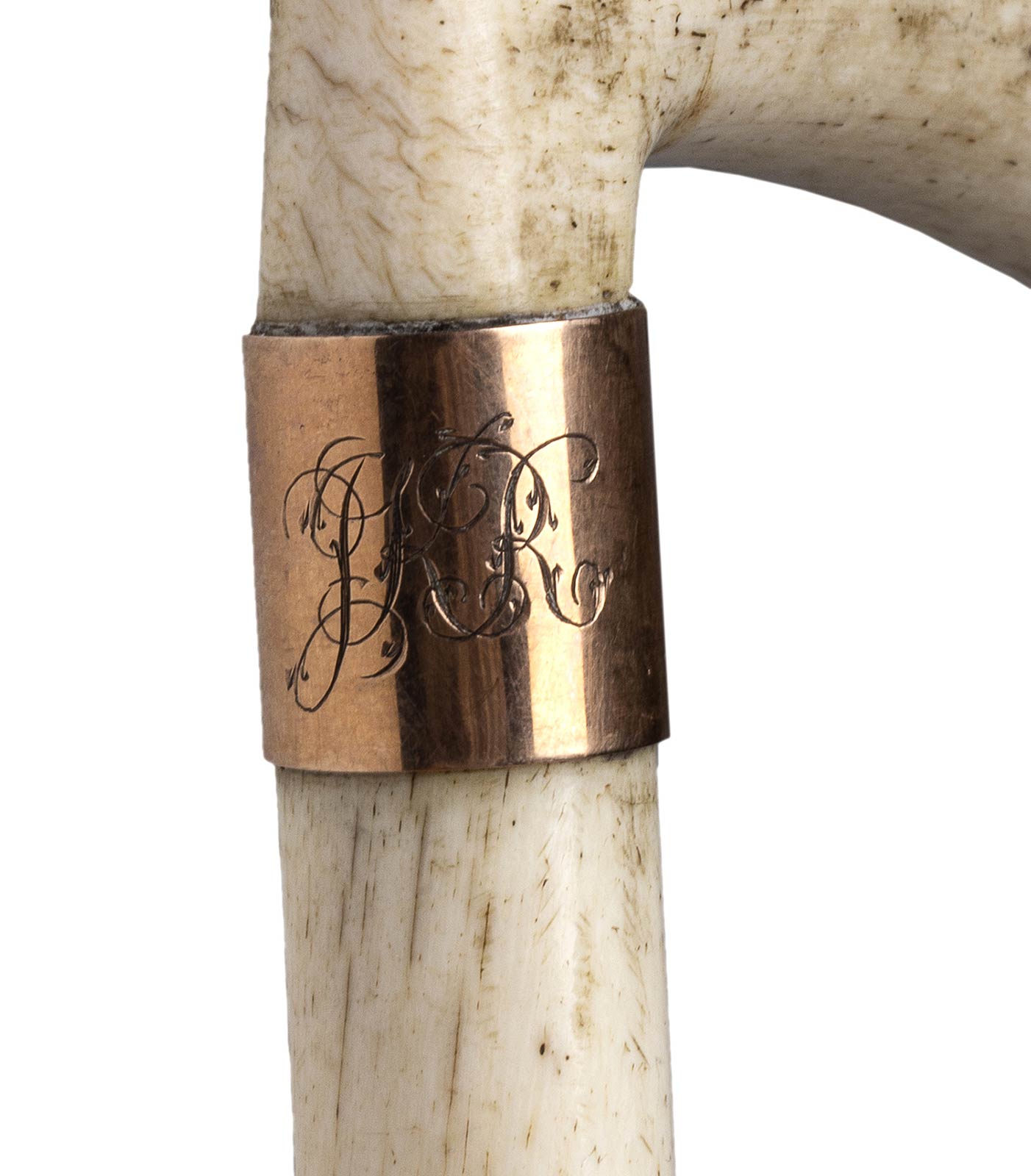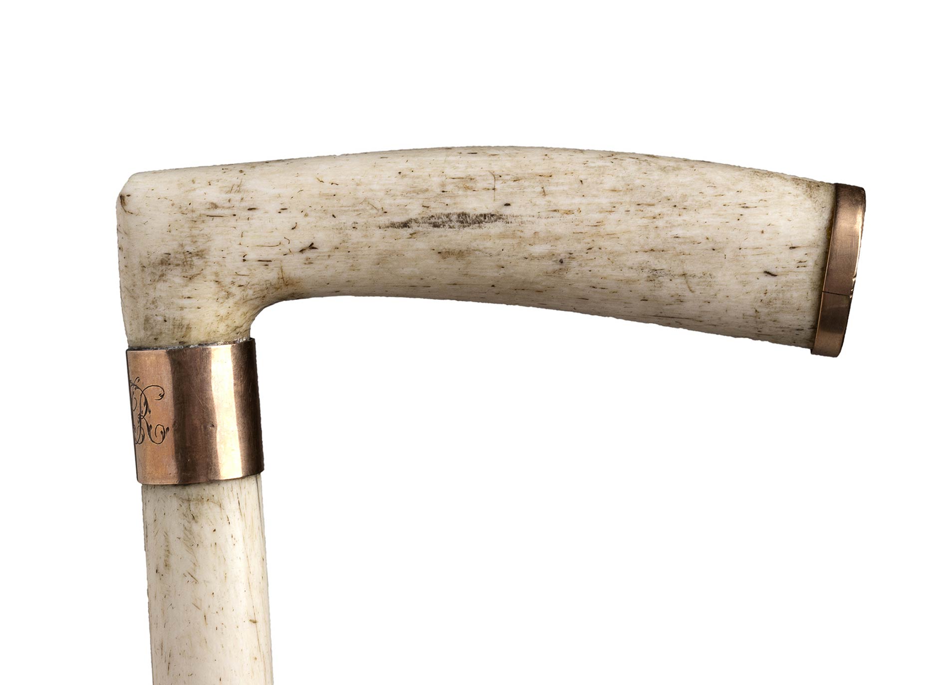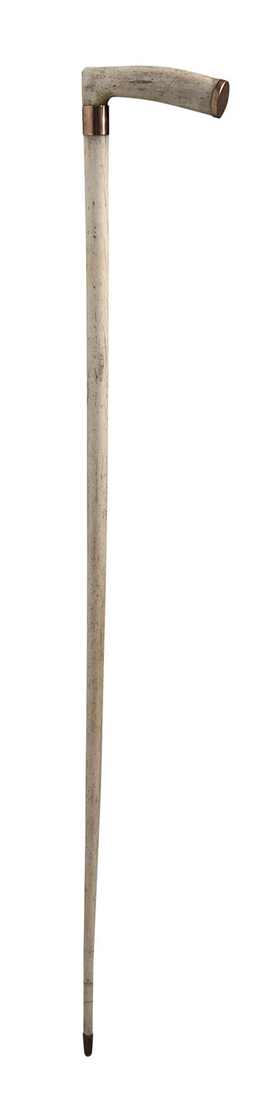 impugnatura ad "L" liscia in osso di balena, asta intera anche essa in osso di balena, collarino in metallo dorato liscio con monogramma e puntale in metallo. Le aste in ossa di balena provengono prevalentemente dai porti della costa orientale degli Stati Uniti e da porti britannici come Whitby, Hull e Leith. Peso 303 gr, altezza 80,5 cm. Stato di conservazione: **** buono. Certificato di Antichità Ce.S.Ar. (pre-1947).