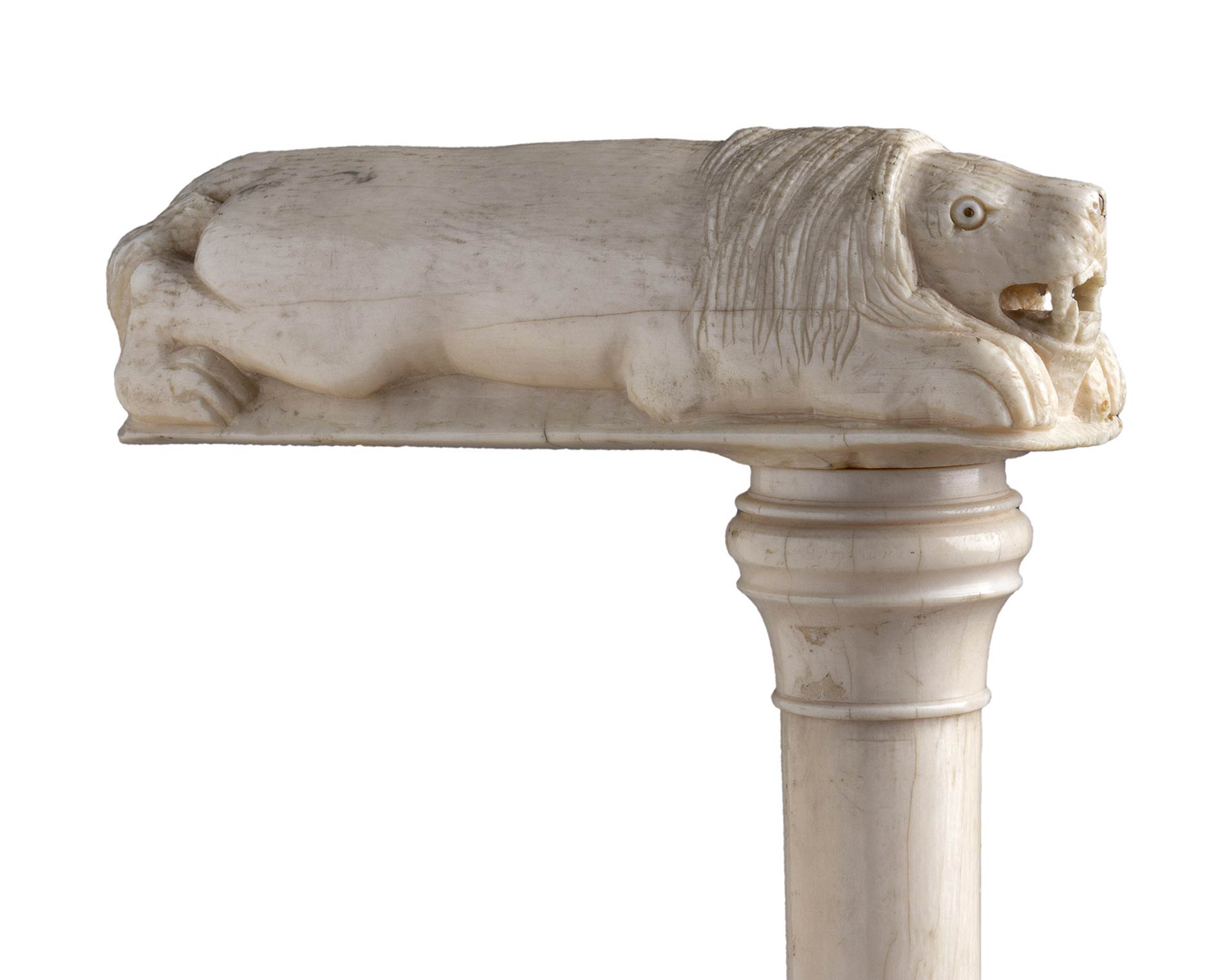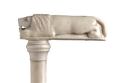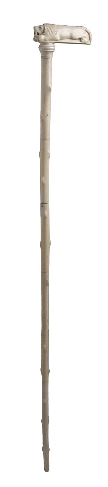 impugnatura ad "L" in avorio di elefante scolpita con un leone. Asta a segmenti di avorio spinato, collarino e puntale in avorio. Peso 460 gr, altezza 91 cm. Stato di conservazione: **** buono. Certificato di Antichità Ce.S.Ar. (pre-1947).