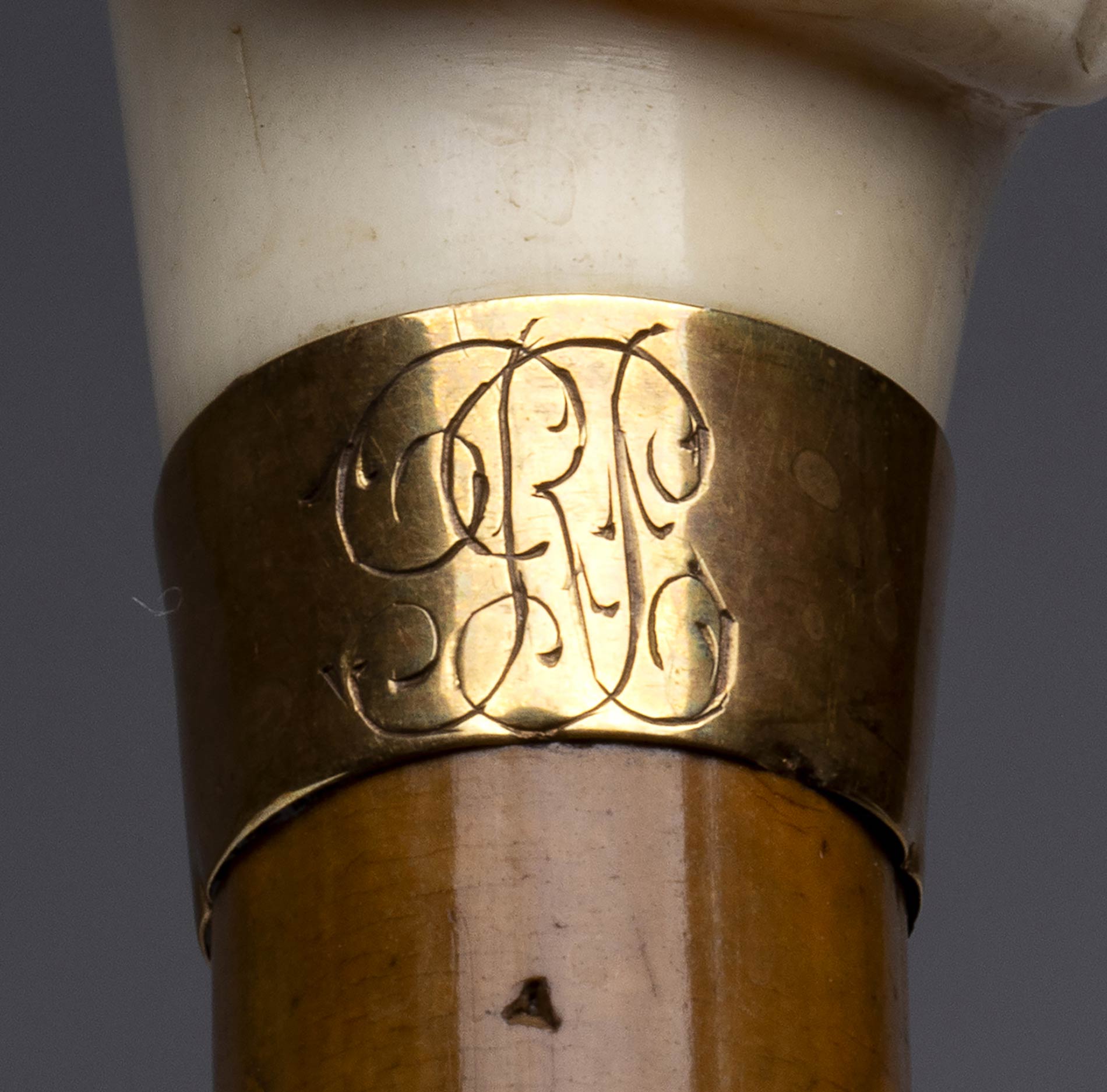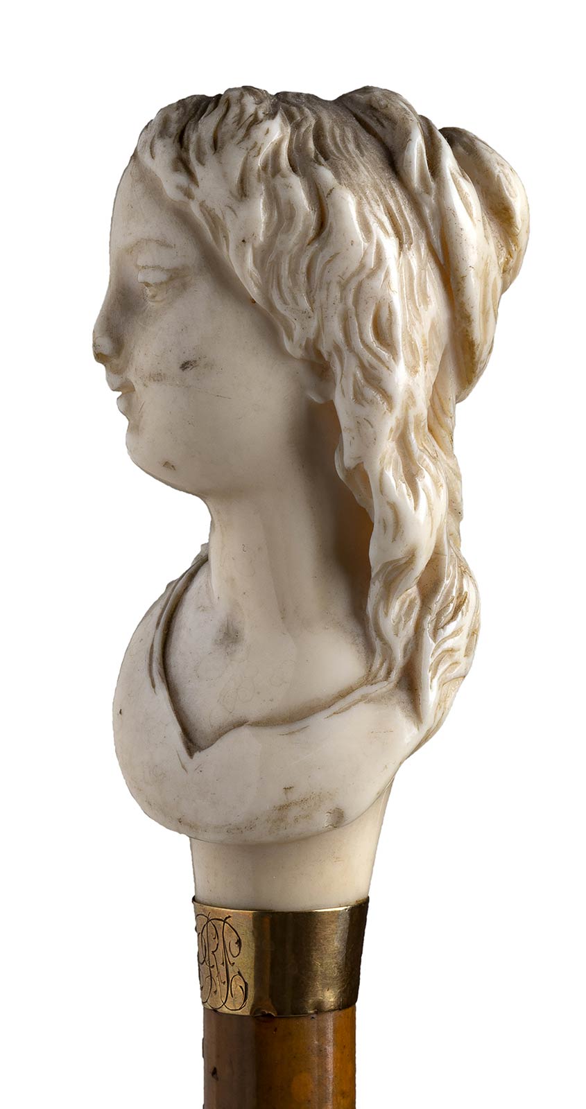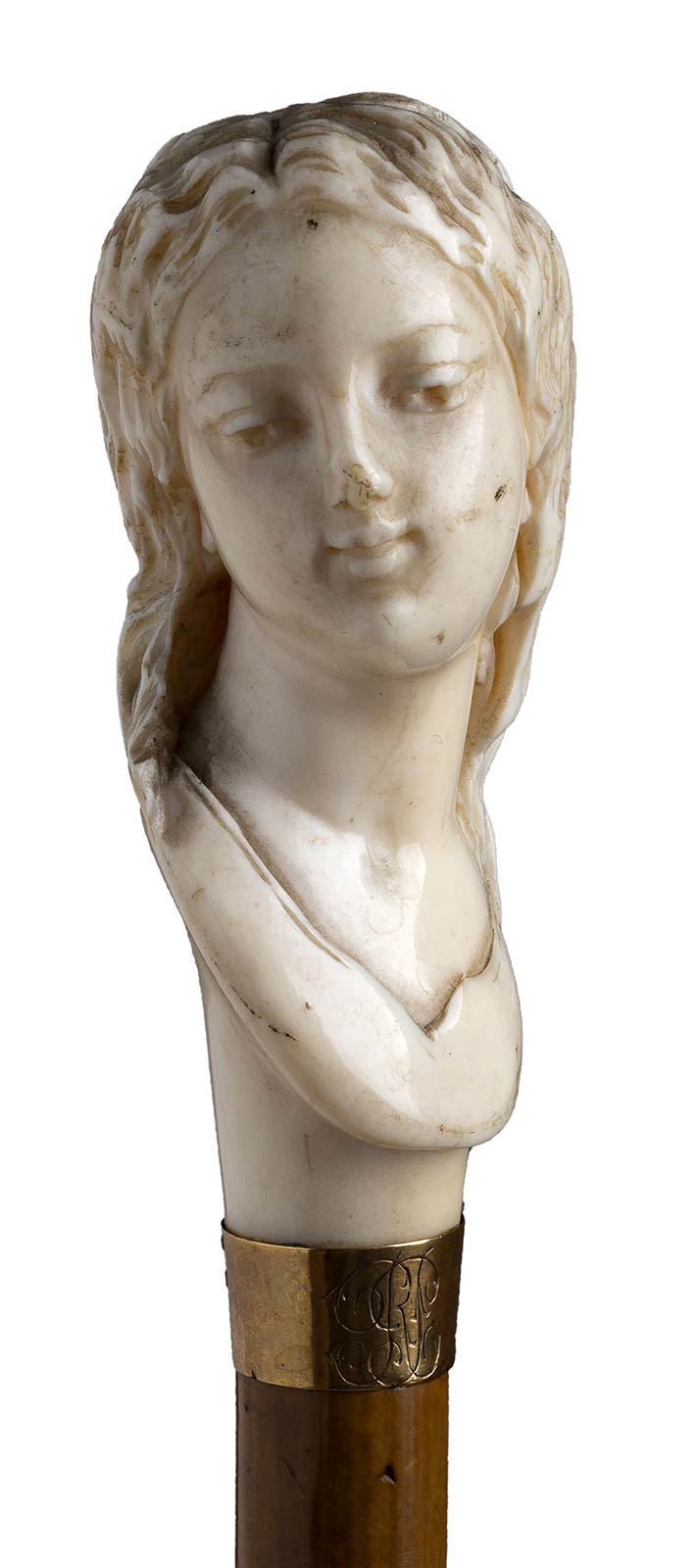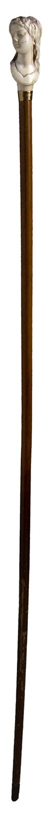 impugnatura verticale in avorio di elefante scolpita con busto di donna. Asta in malacca, collarino in metallo dorato con monogramma e puntale in metallo. Peso 114 gr, altezza 89 cm. Stato di conservazione: **** buono. Certificato di Antichità Ce.S.Ar. (pre-1947).