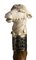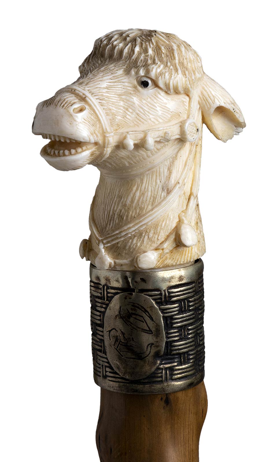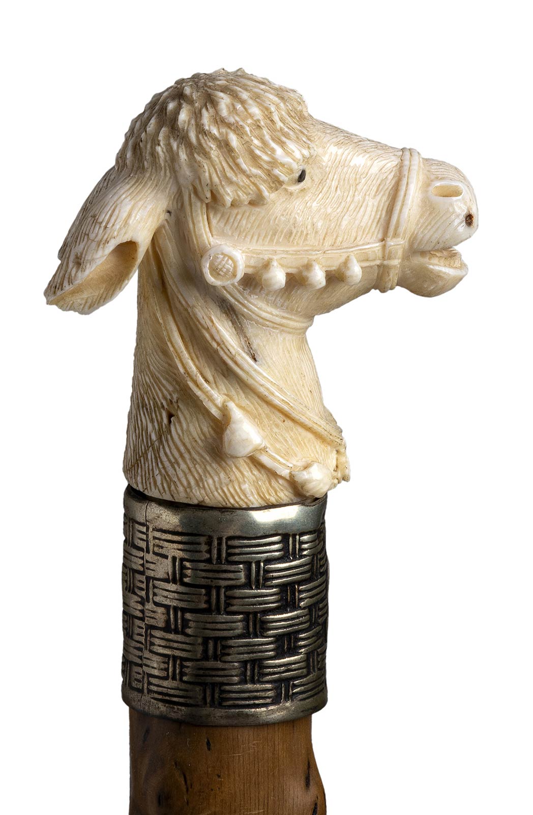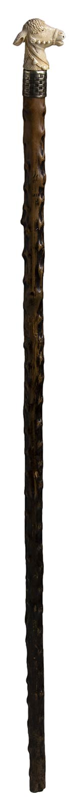 impugnatura a pomolo in avorio di elefante scolpita con testa di asino. Asta in biancospino, collarino in metallo. Peso 184 gr, altezza 80,5 cm. Stato di conservazione: **** quite good (puntale assente). Certificato di Antichità Ce.S.Ar. (pre-1947).