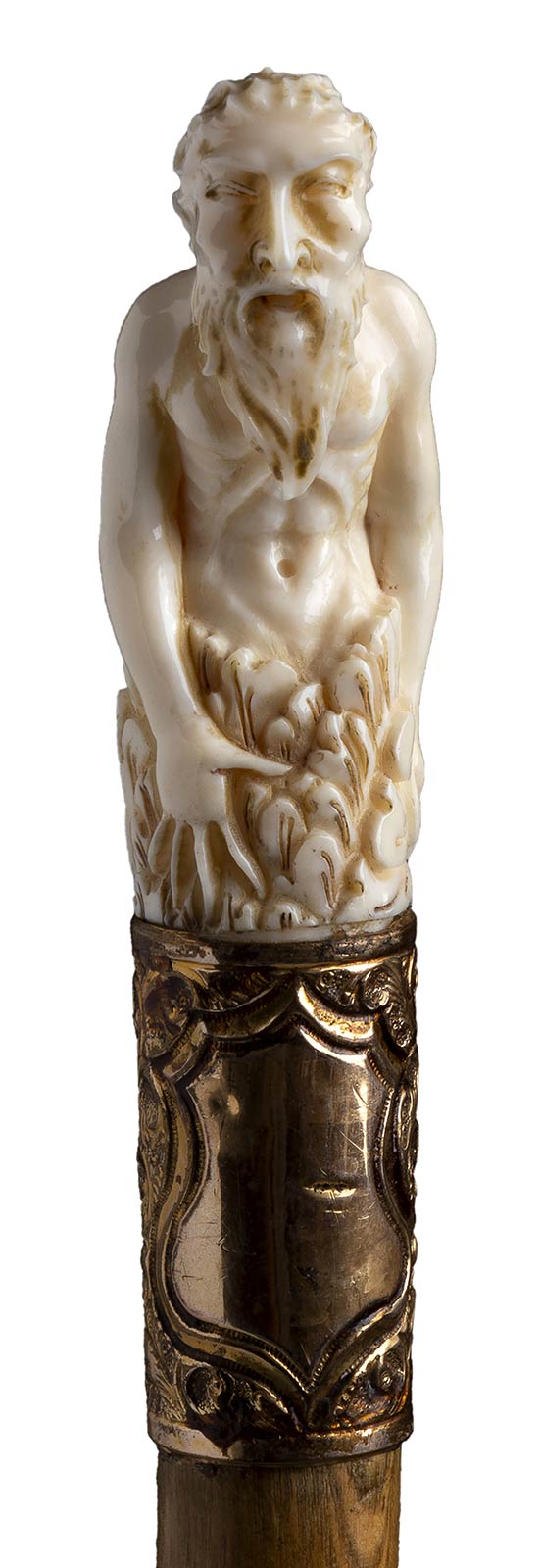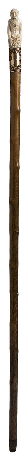 impugnatura verticale in avorio di elefante scolpita con personaggio maschile. Asta in legno spinato, collarino in metallo dorato con punzonatura inglese e puntale in metallo. Peso 211 gr, altezza 89 cm. Stato di conservazione: **** buono. Certificato di Antichità Ce.S.Ar. (pre-1947).