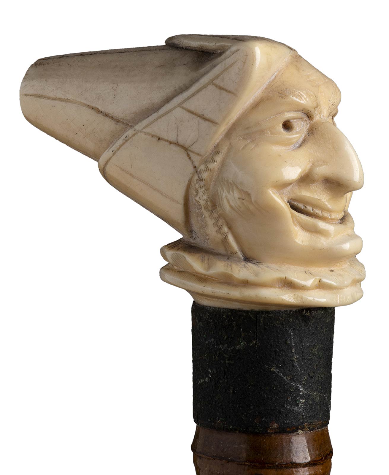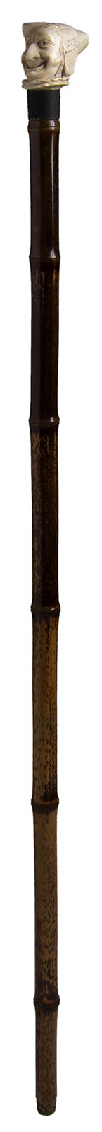 impugnatura ad "L" in avorio di elefante scolpita con testa di personaggio maschile. Asta in bamboo, collarino in metallo. Peso 233 gr, altezza 88,5 cm. Stato di conservazione: **** quasi buono (puntale assente). Certificato di Antichità Ce.S.Ar. (pre-1947).