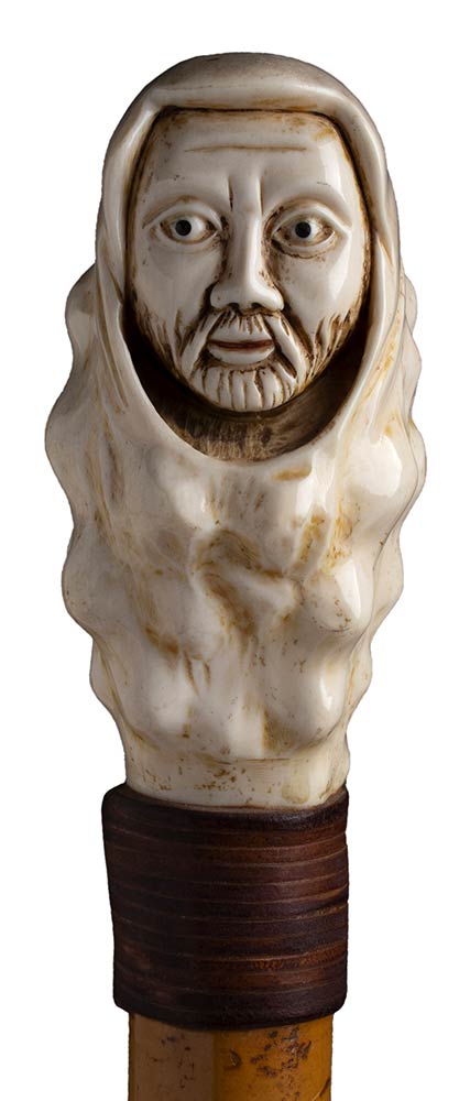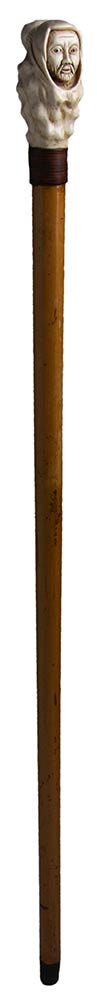 impugnatura giapponese a pomolo in avorio di elefante scolpita con testa di personaggio maschile. Asta in malacca, collarino in cuoio e puntale in metallo. Peso 521 gr, altezza 95,5 cm. Stato di conservazione: **** buono. Certificato di Antichità Ce.S.Ar. (pre-1947).