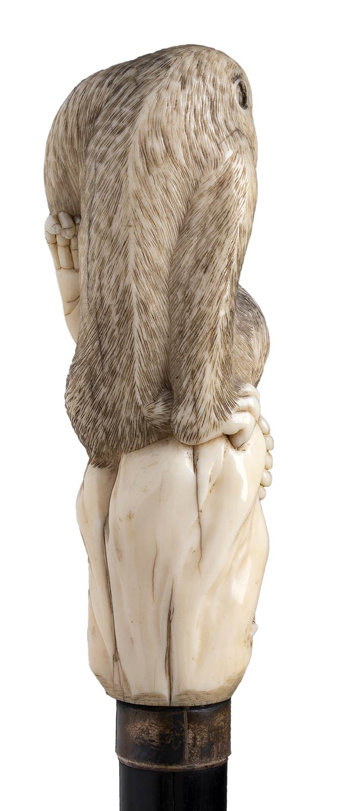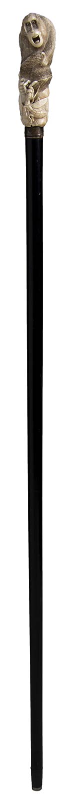 impugnatura giapponese verticale in avorio di elefante scolpita con macaco e amantide religiosa. Asta in ebano, collarino in metallo liscio e puntale in metalllo. Peso 318 gr, altezza 85 cm. Stato di conservazione: **** buono. Certificato di Antichità Ce.S.Ar. (pre-1947).