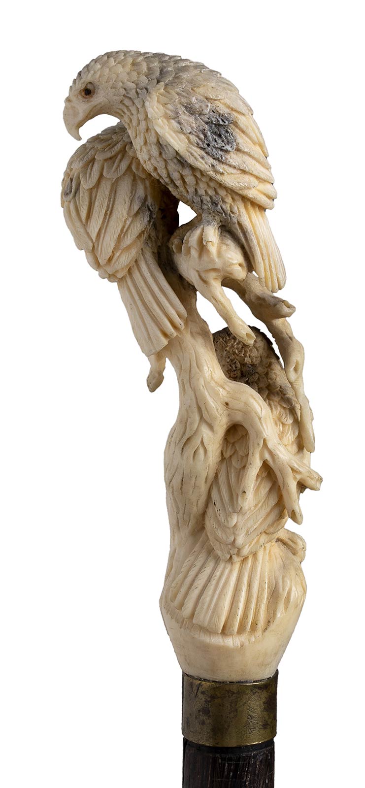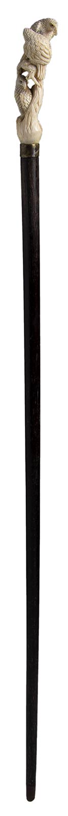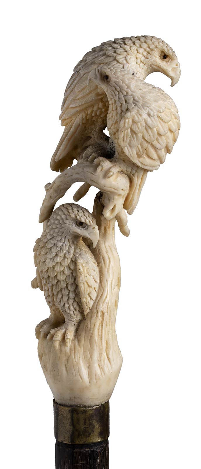 impugnatura giapponese verticale in osso scolpita con tre aquile poste su un tronco d'albero. Asta in ebano, collarino in metallo liscio e puntale in metallo. Peso 255 gr, altezza 90 cm. Stato di conservazione: **** buono. Certificato di Antichità Ce.S.Ar.