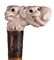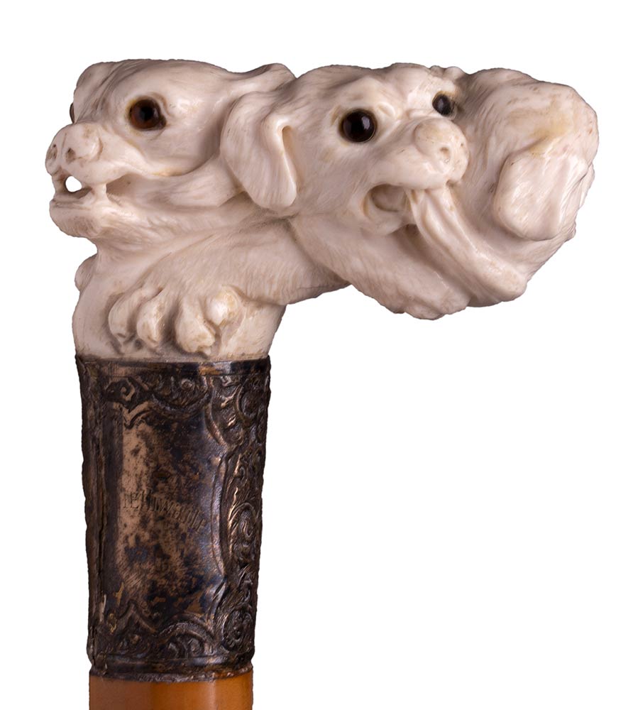 impugnatura ad "L" in avorio di elefante scolpita con teste di cane. Asta in malacca, collarino in argento 925/1000 decorato con stilemi floreali punzonato Birmingham 1904-05 e puntale in metallo. Peso 361 gr, altezza 90,5 cm. Stato di conservazione: **** buono. Certificato di Antichità Ce.S.Ar. (pre-1947)