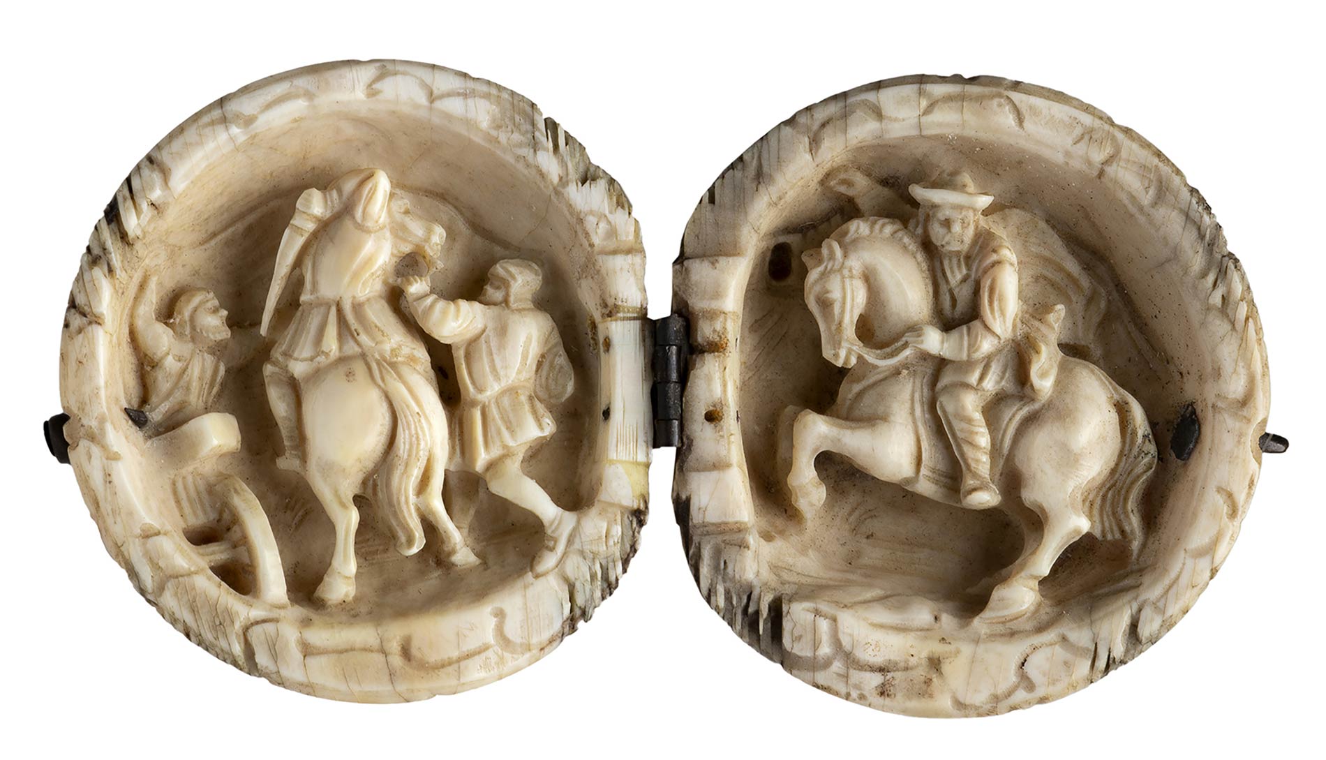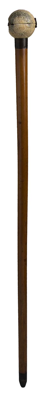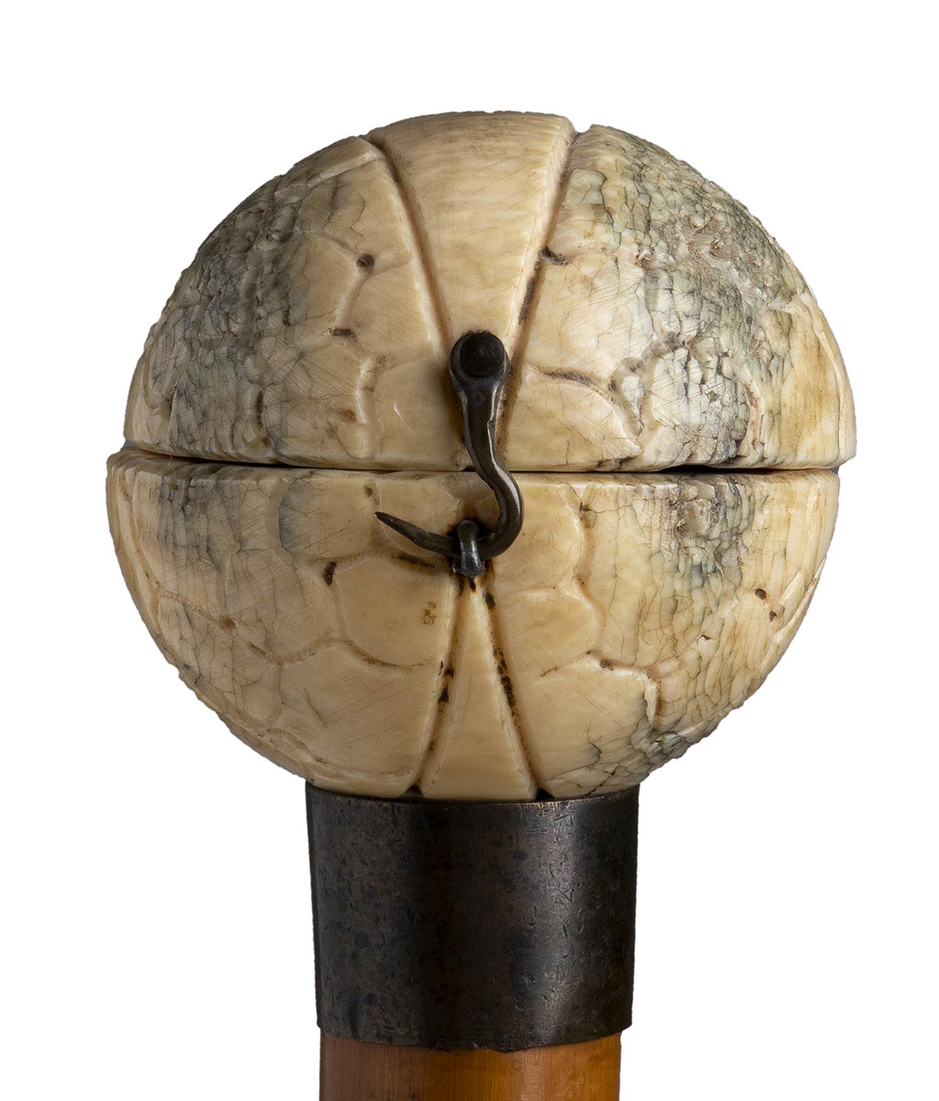 impugnatura in avorio di elefante a pomolo apribile scolpito al suo interno con cavalieri. Asta in malacca, collarino in metallo liscio e puntale in metallo. Peso 415 gr, altezza 89 cm. Stato di conservazione: **** buono. Certificato di Antichità Ce.S.Ar. (pre-1947).