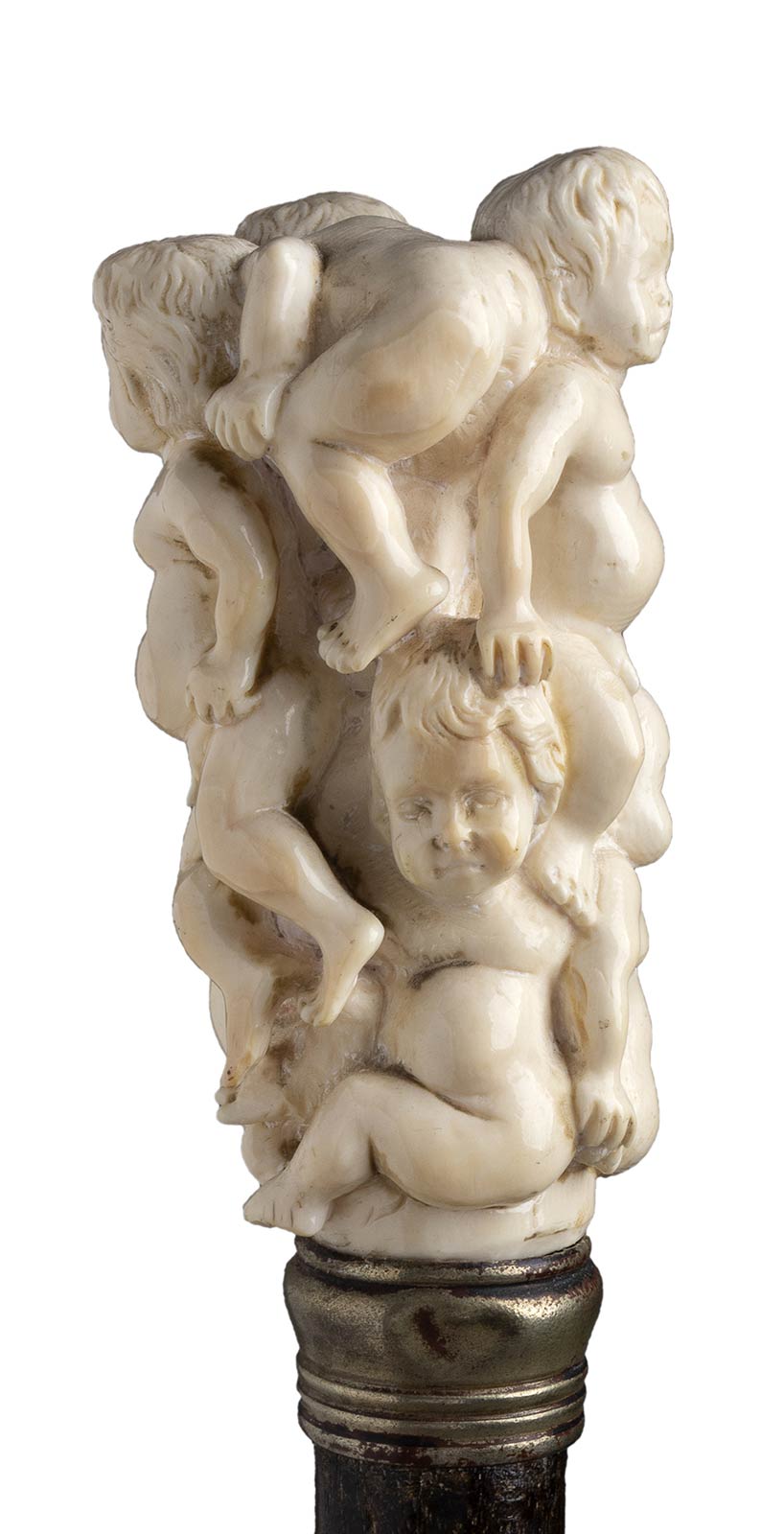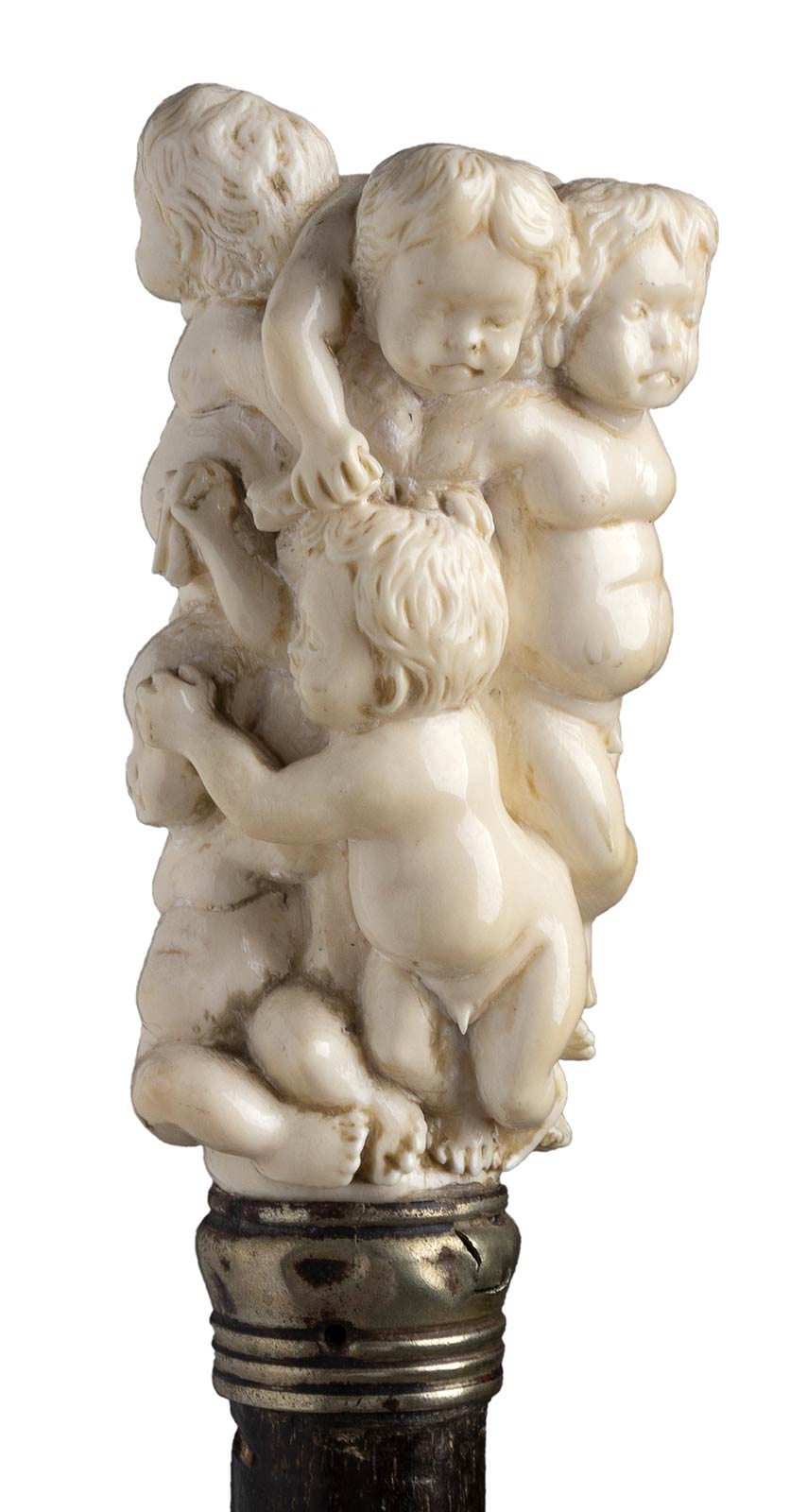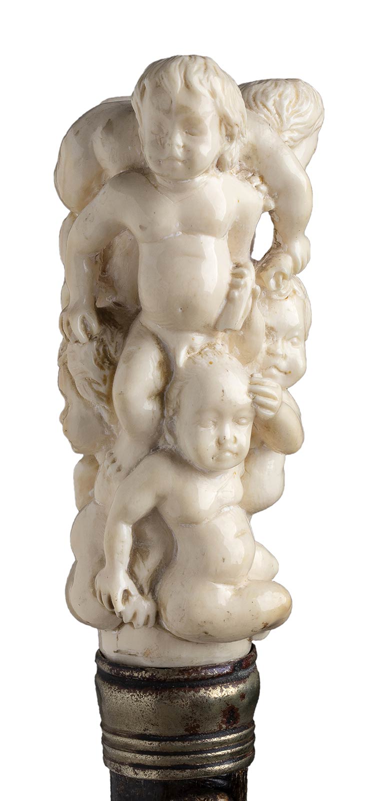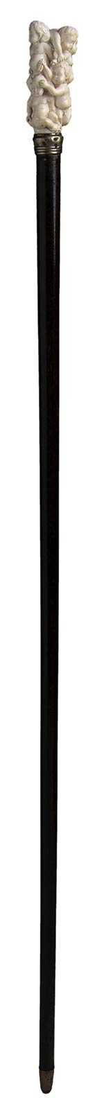 impugnatura verticale in avorio di elefante scolpita con sei putti festanti. Asta in mogano, collarino in metallo liscio e puntale in metallo. Peso 269 gr, altezza 82 cm. Stato di conservazione: **** buono. Certificato di Antichità Ce.S.Ar. (pre-1947)