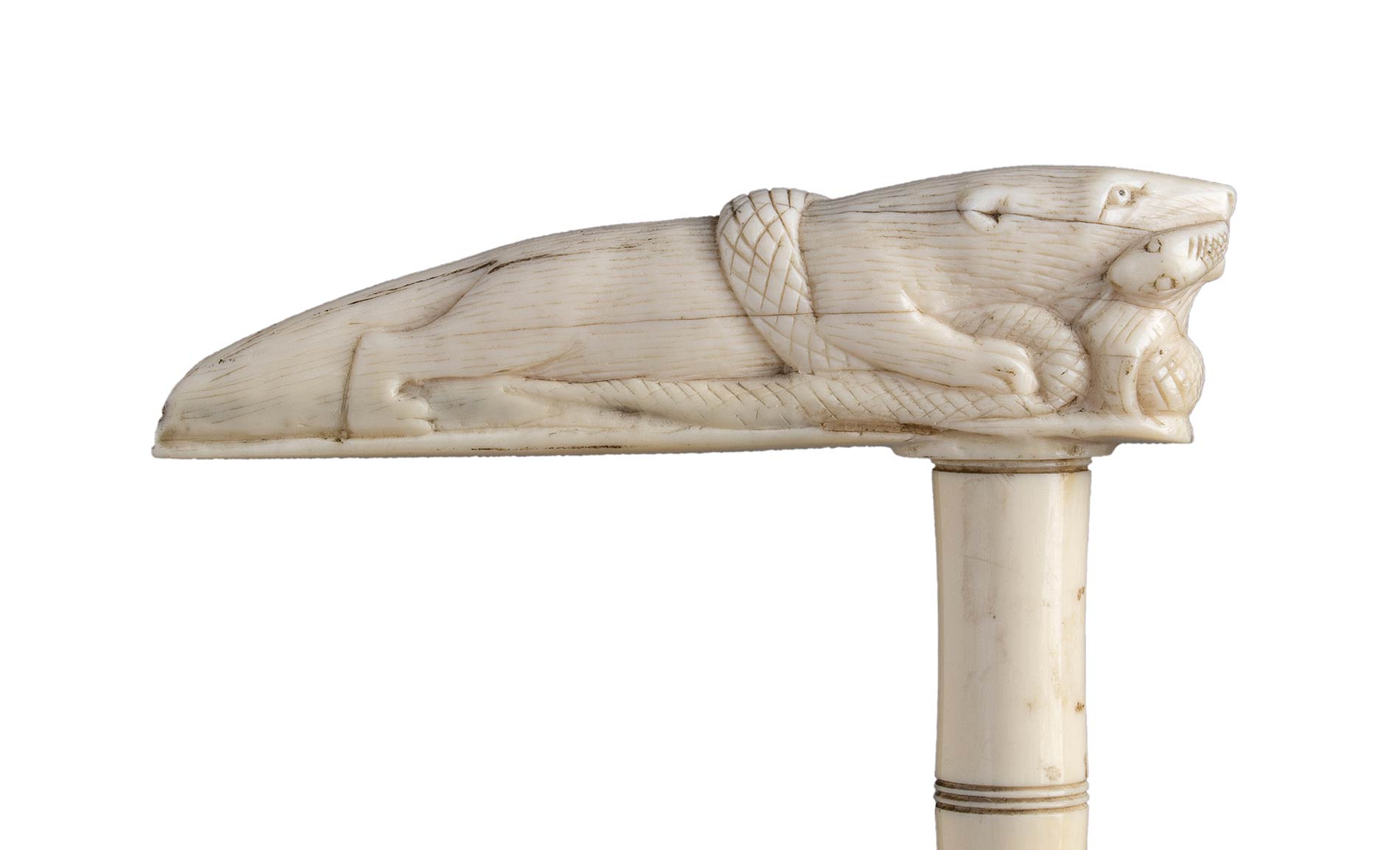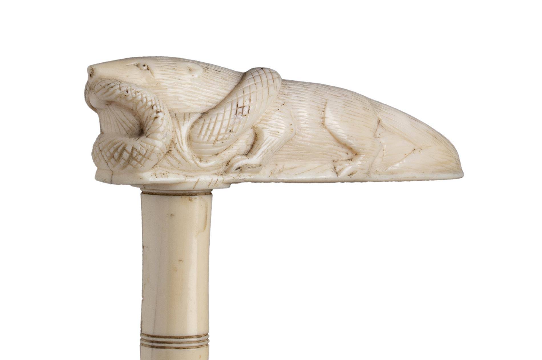 impugnatura ad "L" in avorio di elefante scolpita con mangusta che azzanna cobra. Asta a segmenti di avorio. Peso 327 gr, altezza 88 cm. Stato di conservazione: **** buono. Certificato di Antichità Ce.S.Ar. (pre-1947).
