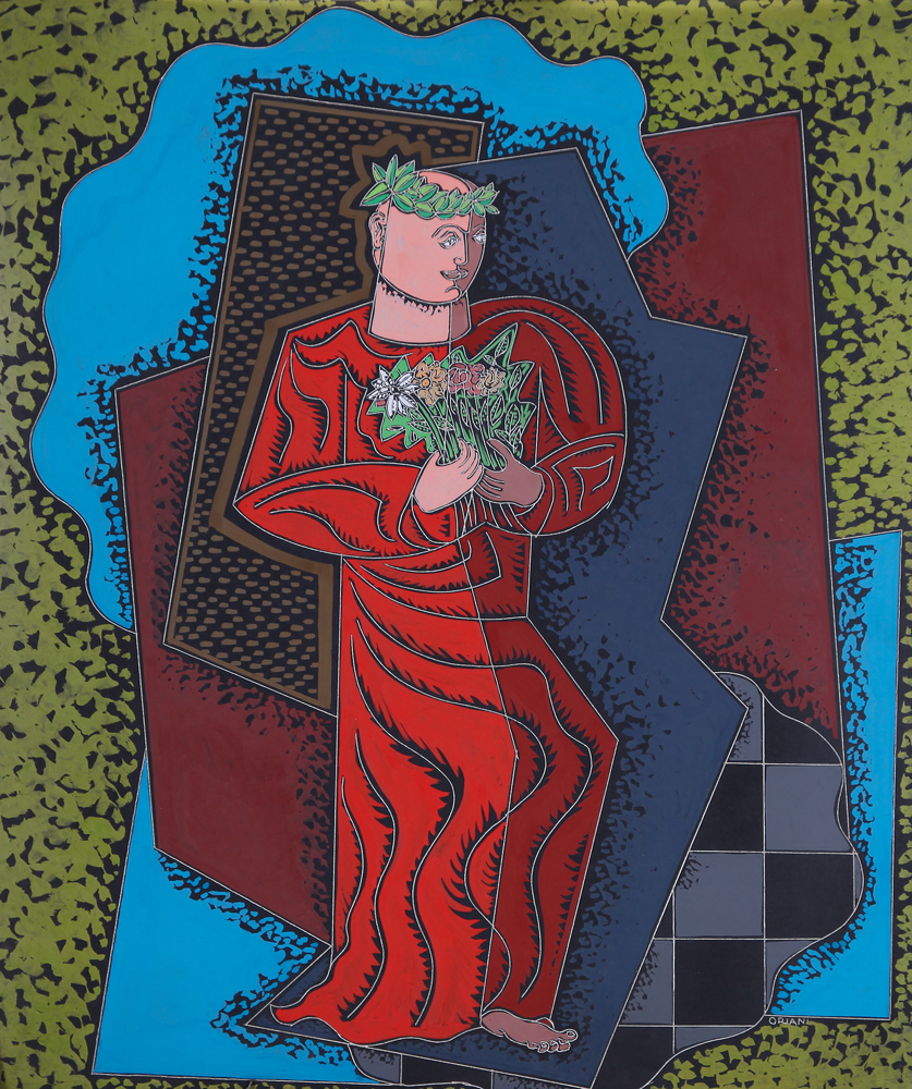 PIPPO ORIANI Torino 25/06/1909 - Roma 01/12/1972 Poeta laureato, 1965-70 encausto, graffito su cartone gessato cm. 60x50, firma in basso a destra, archivio dell'artista numero 859, etichetta e timbri della Galleria La Lanterna (AL) al retro, pubblicato sul Catalogo Generale delle Opere di Oriani volume primo, testi di Giovanni Lista e Mariastella Margozzi, Editoriale Giorgio Mondadori, pagina 312, repertorio FPO/MV541.
