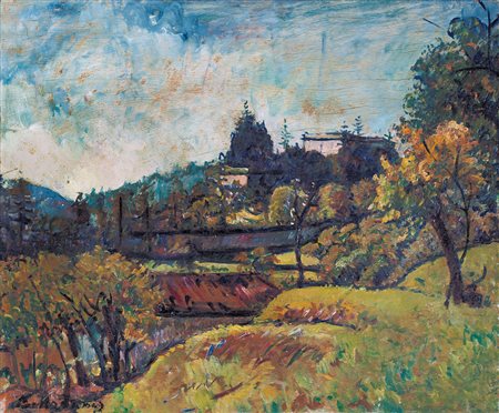 PIERO MARUSSIG Trieste 16/05/1879 - Pavia 13/10/1937 Paesaggio, (1931) olio su tavola cm. 50x60, firma in basso a sinistra, opera registrata presso l'Archivio Piero Marussig a cura della Dott.ssa Nicoletta Colombo ed Elena Pontiggia come da dichiarazione su foto, presenta filature alla tavola.