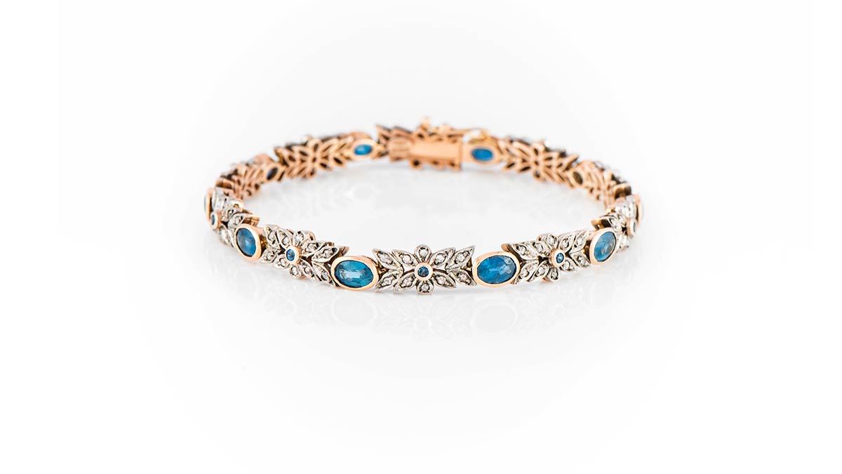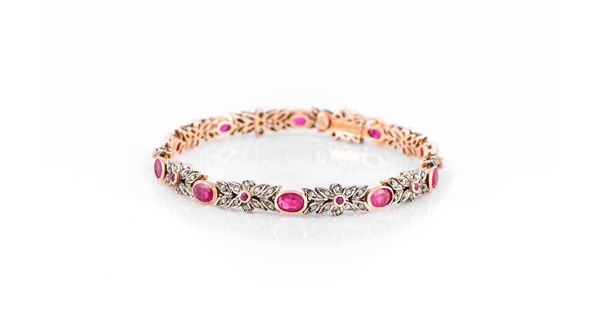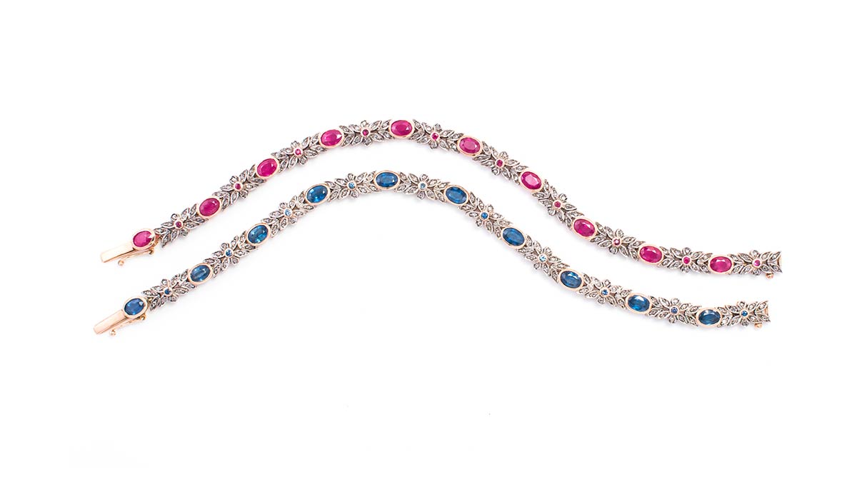 Bracciali artigianali realizzati in Italia negli anni '40, composti da oro giallo K 14 e una sottile lamina in argento a copertura dei castoni dei diamanti. Lunghezza 190 mm ciascuno; peso tot. Bracciale con rubini 16,84, quello con zaffiri 16.50 gr. Ciascuno presenta le seguenti pietre: - diamanti con taglio antico di ct. 0,52 - corindoni naturali di forma ovale di ct. 6,10 (rubini e zaffiri)
