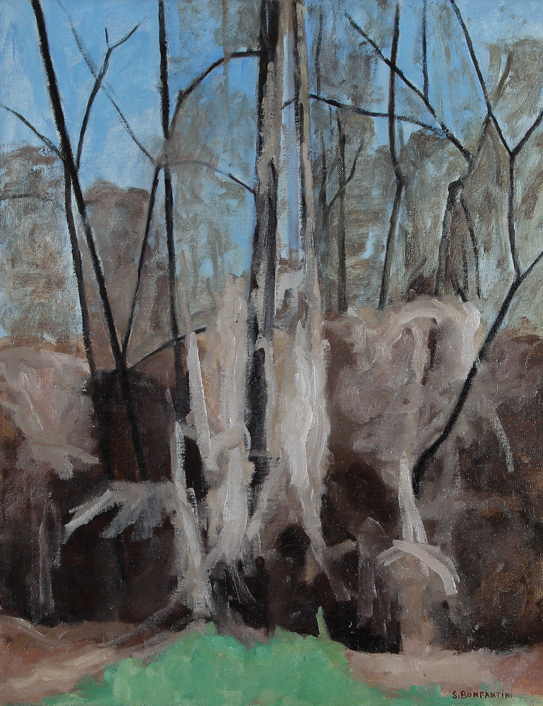 SERGIO BONFANTINI Novara 28/04/1910 - 22/01/1989 Boscaglia, 1965 olio su tela cm. 77x60, firma in basso a destra, anno, firma ed etichetta della Galleria Annunciata (MI) al retro, Archivio Generale delle opere di Sergio Bonfantini numero 179 a cura della Galleria d'Arte Rotaross (No) su foto, pubblicato sul catalogo della mostra "Casorati Bonfantini" tenutasi presso la Galleria Rotaross (NO) dal 11 novembre al 10 dicembre 2006, pagina 34.