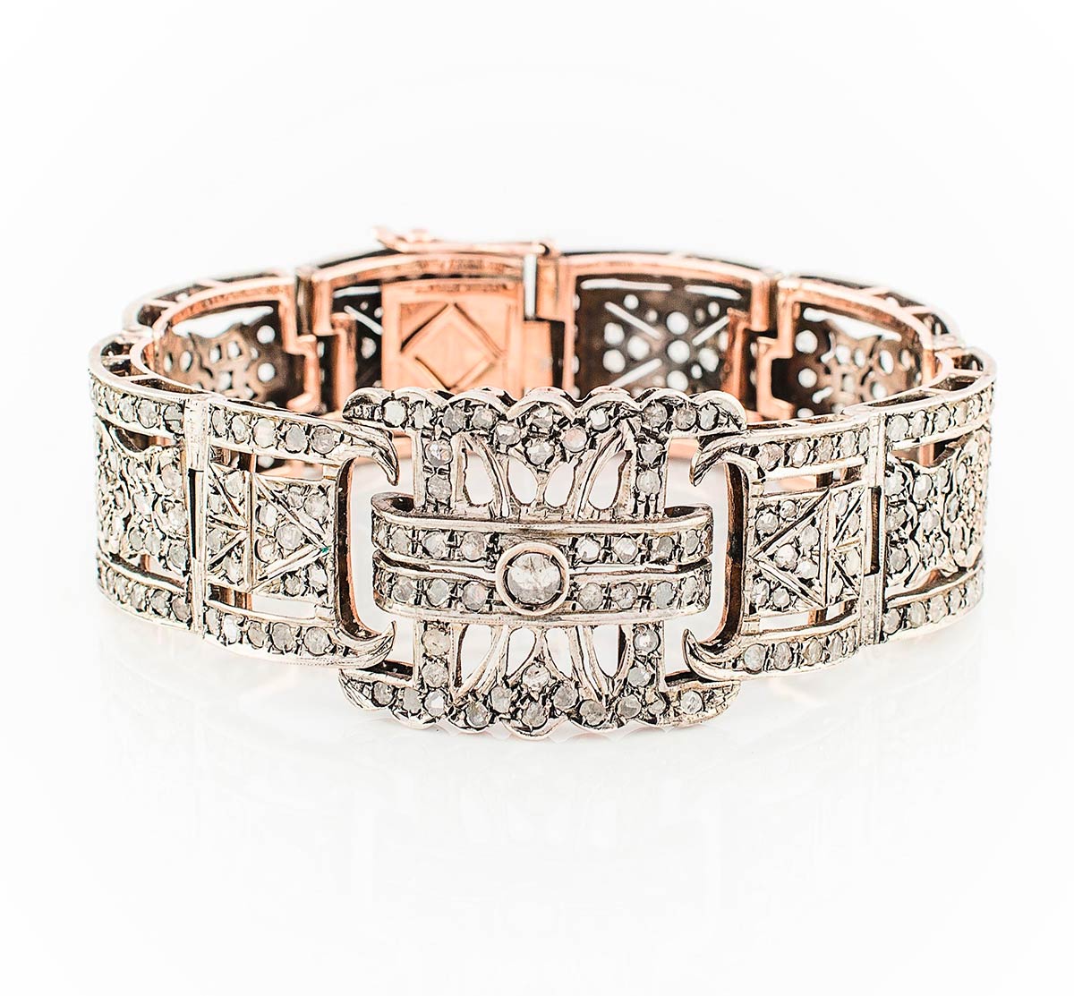 Bracciale artigianale realizzato in Italia nel periodo Liberty in oro giallo K 14 e argento con diamanti taglio vecchio di ct. 10. Lunghezza 190,4 mm, larghezza 24 mm e peso 39,85 gr.