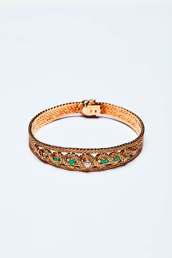 Bracciale artigianale realizzato in Italia negli anni '60 in oro giallo K 18 con brillante centrale di ct. 0,20 E smeraldi di ct. 0,40 . Misure bracciale 185x13,6 mm e peso di 41,40 gr.
