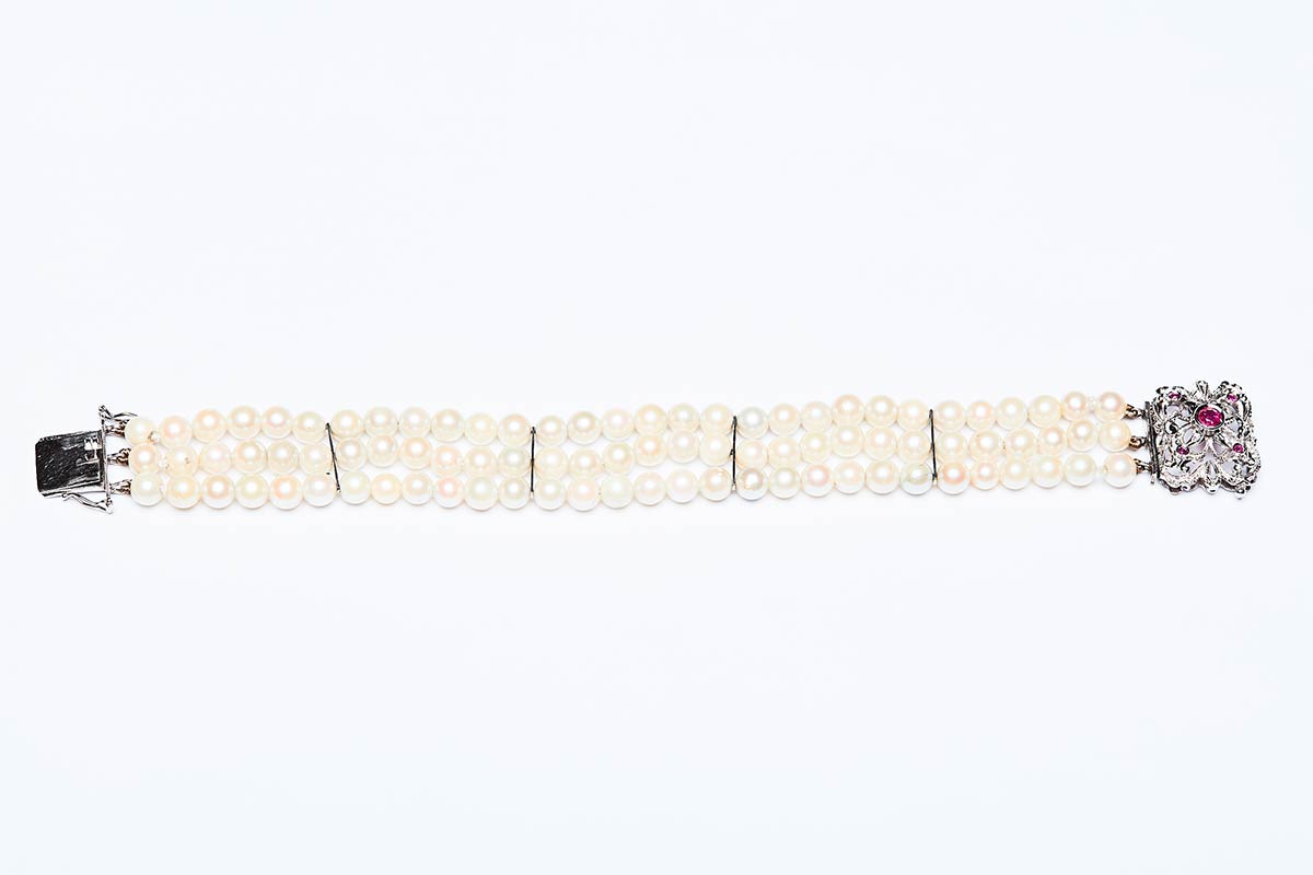 Bracciale artigianale realizzato in Italia negli anni '30 in oro bianco K 18 con 3 fili di perle di mm 6 ciascuna e rubini ct. 0,40. Misure bracciale 198,3x23 mm, peso 32,39 gr.