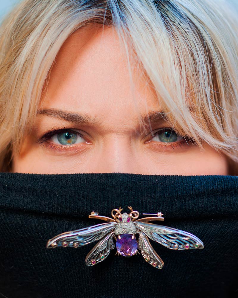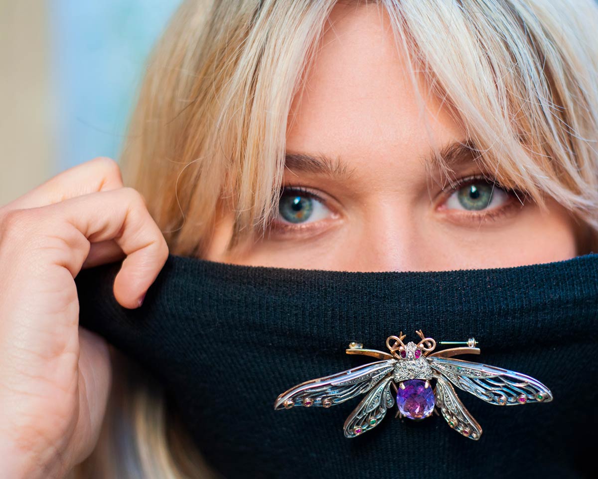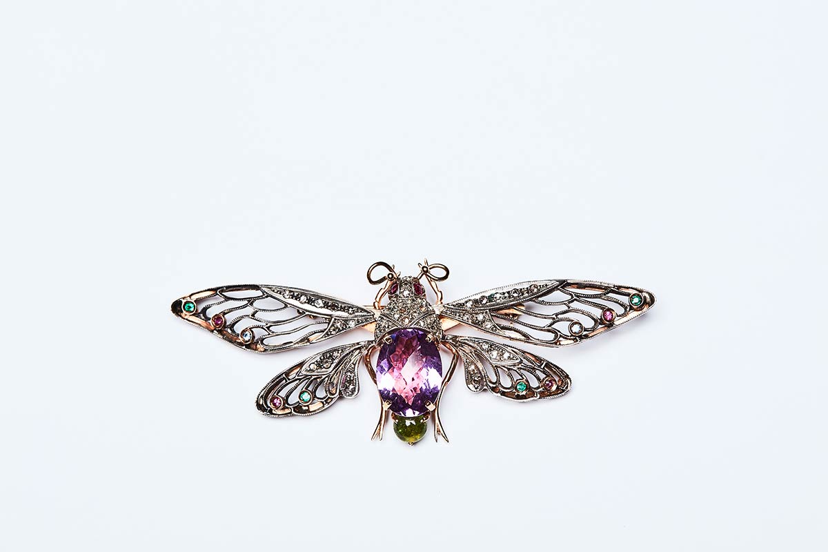 Spilla artigianale realizzata in Italia nel periodo Liberty in oro giallo K 14 e una sottile lamina in argento a copertura dei castoni. Decorata con diamanti vecchio taglio di 0,55 ct. E smeraldi, rubini e zaffiri di ct. Tot. 0,90. Corpo centrale formato da ametista di ct.8 ed una turmalina verde di ct. 0.90. Misure 91,3x34,7 mm, peso 21,24 gr.