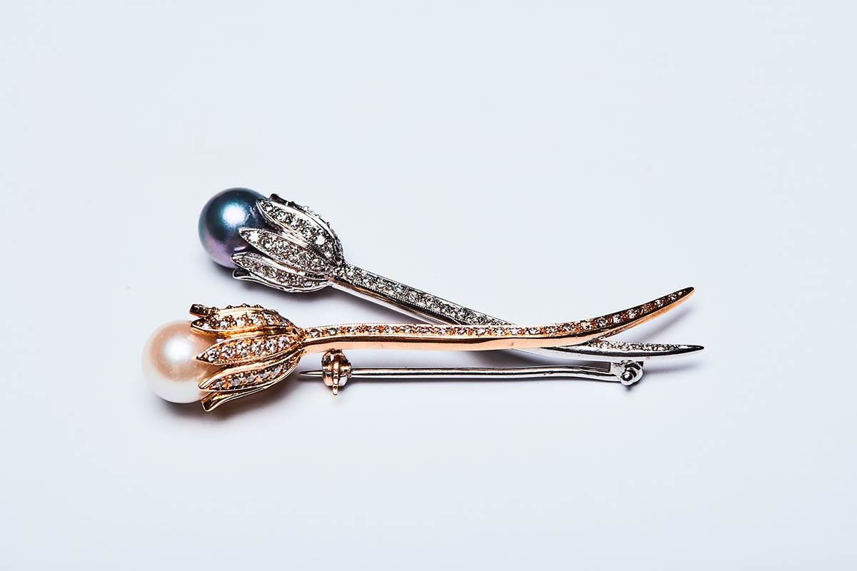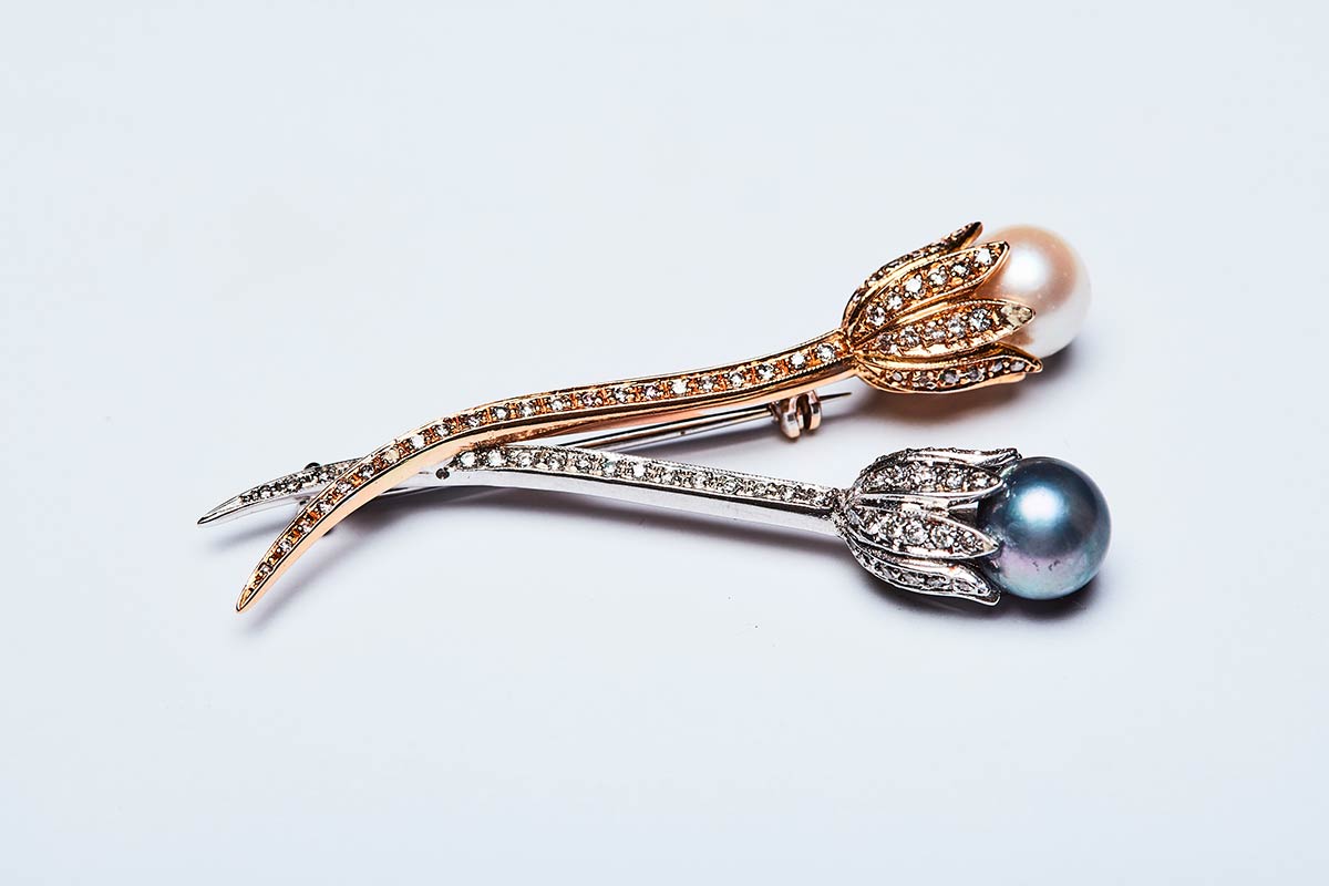 Spilla artigianale realizzata in Italia negli anni '50 in oro giallo e bianco K 18 con brillanti di ct.1,5. La spilla rappresanta due fiori i cui boccioli sono formati da una perla bianca ed una grigia, ciascuna di mm 8,5. Misure 55,3x27,7 mm, peso 10,37 gr.