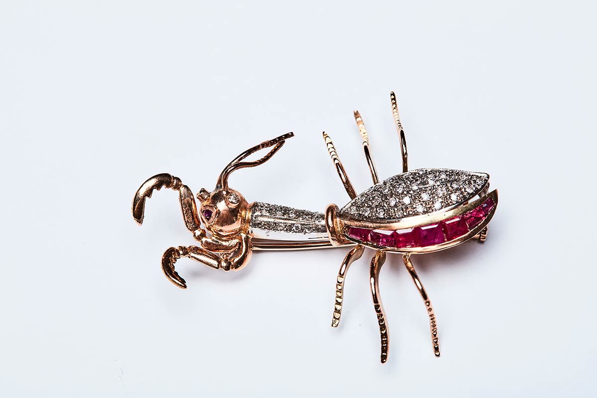 Spilla artigianale realizzata in Italia negli anni '50 in oro giallo K 14 con brillanti ct. 1,20 e rubiti ct. 3. Lunghezza 53.56 mm, peso 12,40 gr.